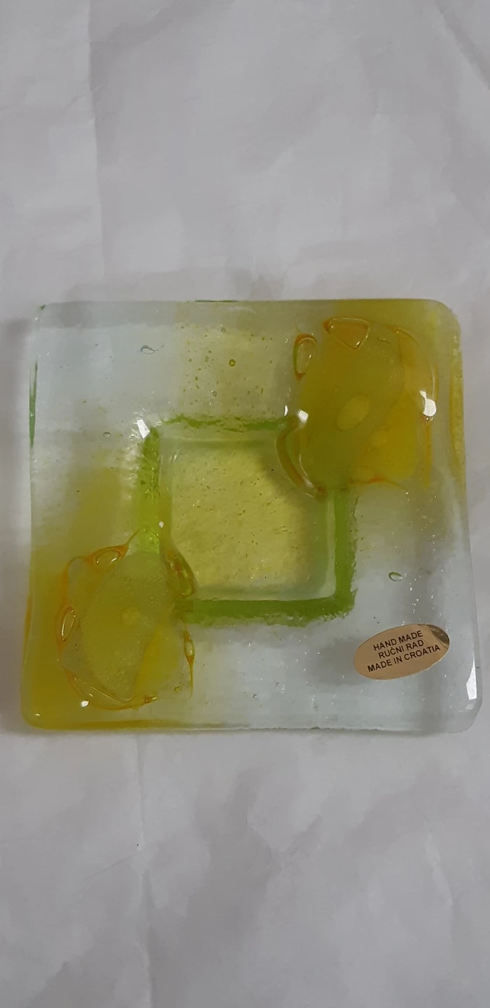 This is a set of 2 lovely handmade glass dishes. One features a yellow floral design and the other has a black and blue polka dot accent.