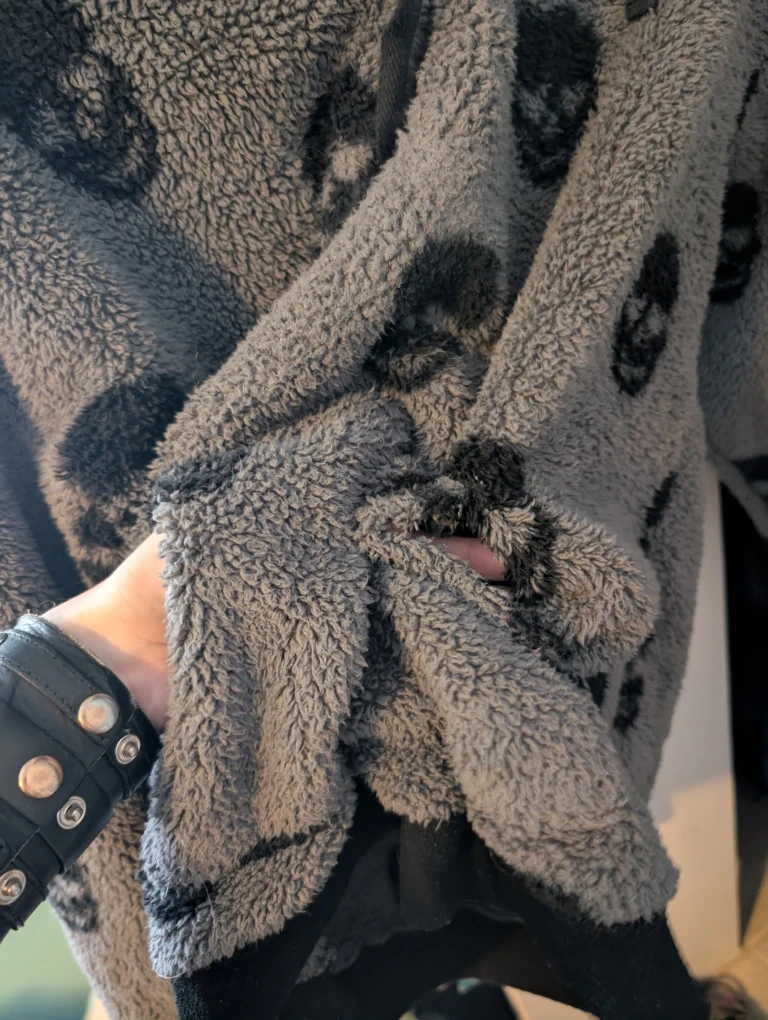 Cozy RSQ Salvage brand hoodie featuring a fun skull pattern! It's a size medium and has a pocket, hood with drawstring, and cuffs at the wrist and waist. Sherpa fluff all over, outside and in. Very soft! Perfect for adding a bit of edge to your casual wear. Machine wash is fine, but make sure to avoid heat so as not to zap the fluff. From home with dogs. North Center (Chicago) near Damen & Montrose