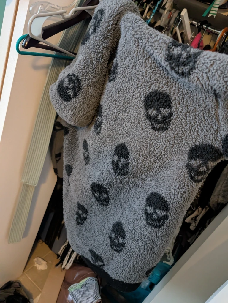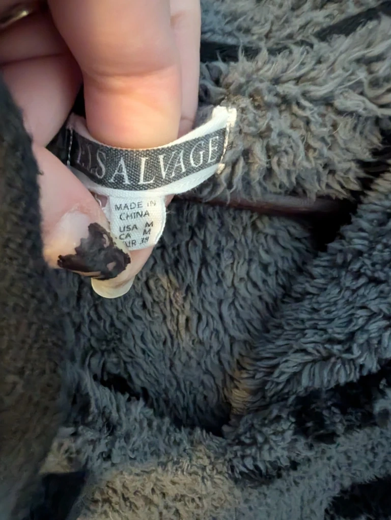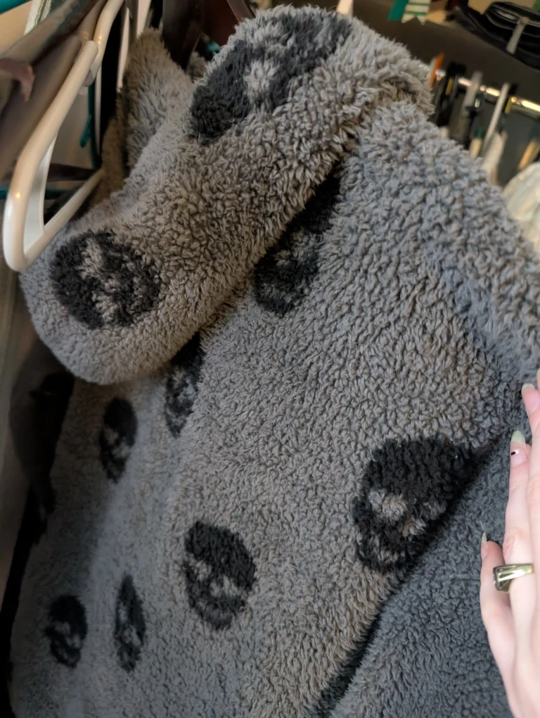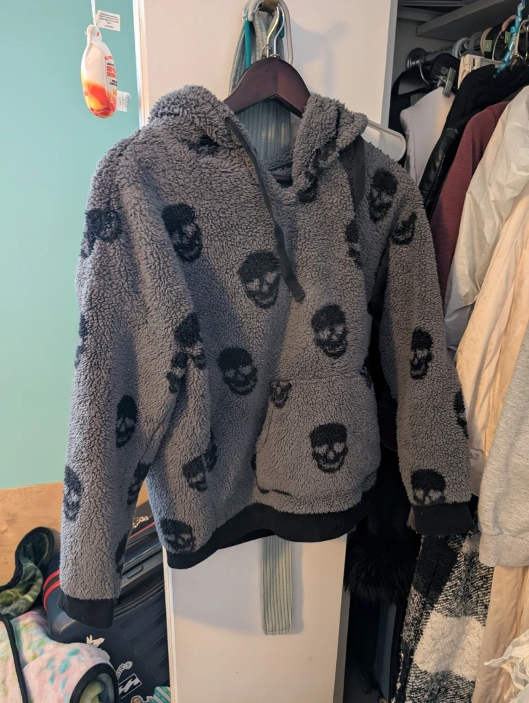 Cozy RSQ Salvage brand hoodie featuring a fun skull pattern! It's a size medium and has a pocket, hood with drawstring, and cuffs at the wrist and waist. Sherpa fluff all over, outside and in. Very soft! Perfect for adding a bit of edge to your casual wear. Machine wash is fine, but make sure to avoid heat so as not to zap the fluff. From home with dogs. North Center (Chicago) near Damen & Montrose