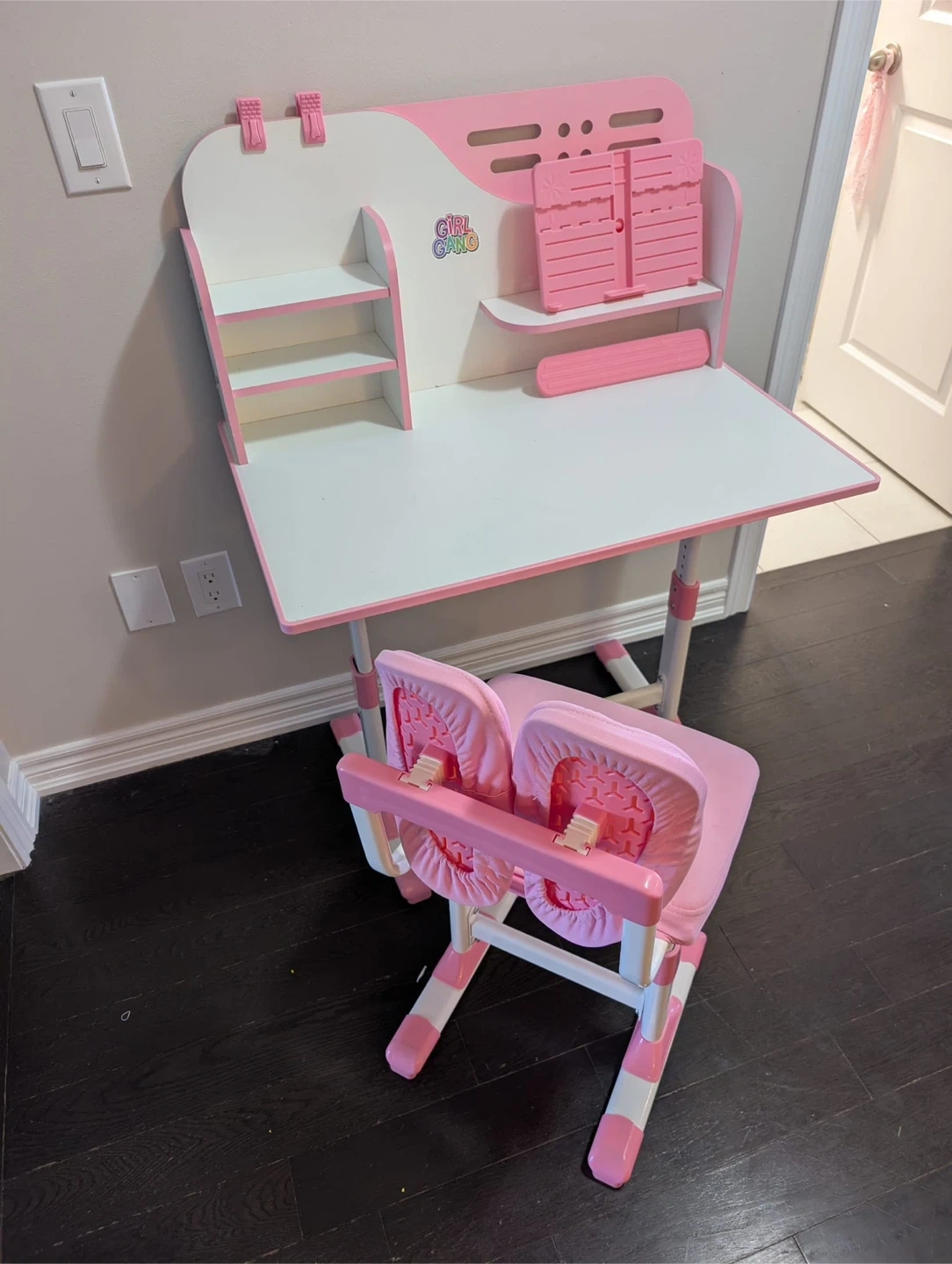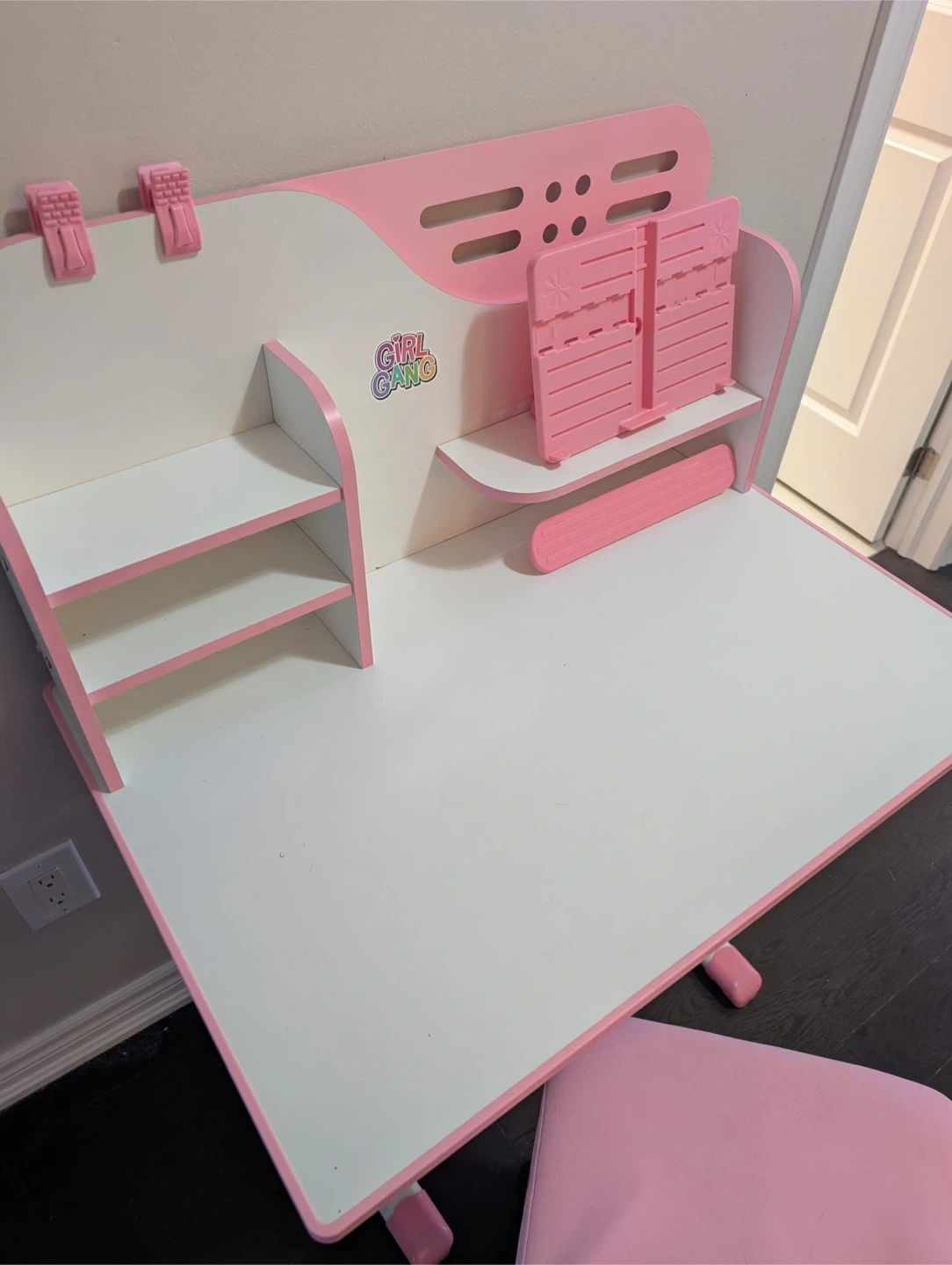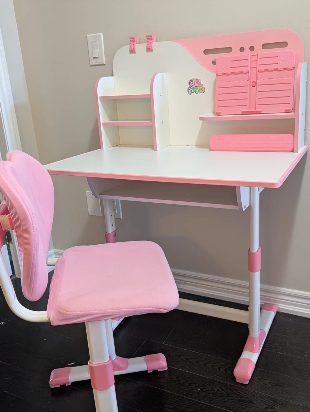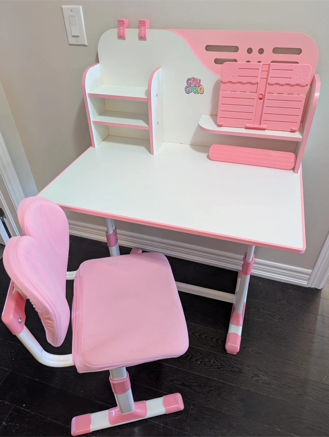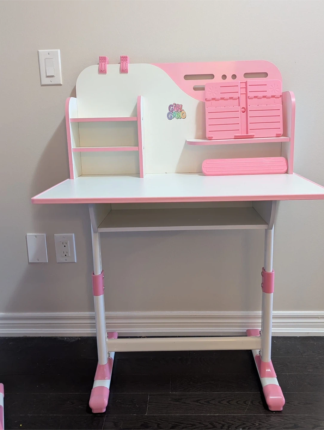 This height-adjustable desk and chair set is perfect for kids. It features two shelves for storage and a pink and white design. The chair is also height-adjustable to grow with your child. It's great for homework and creative projects!