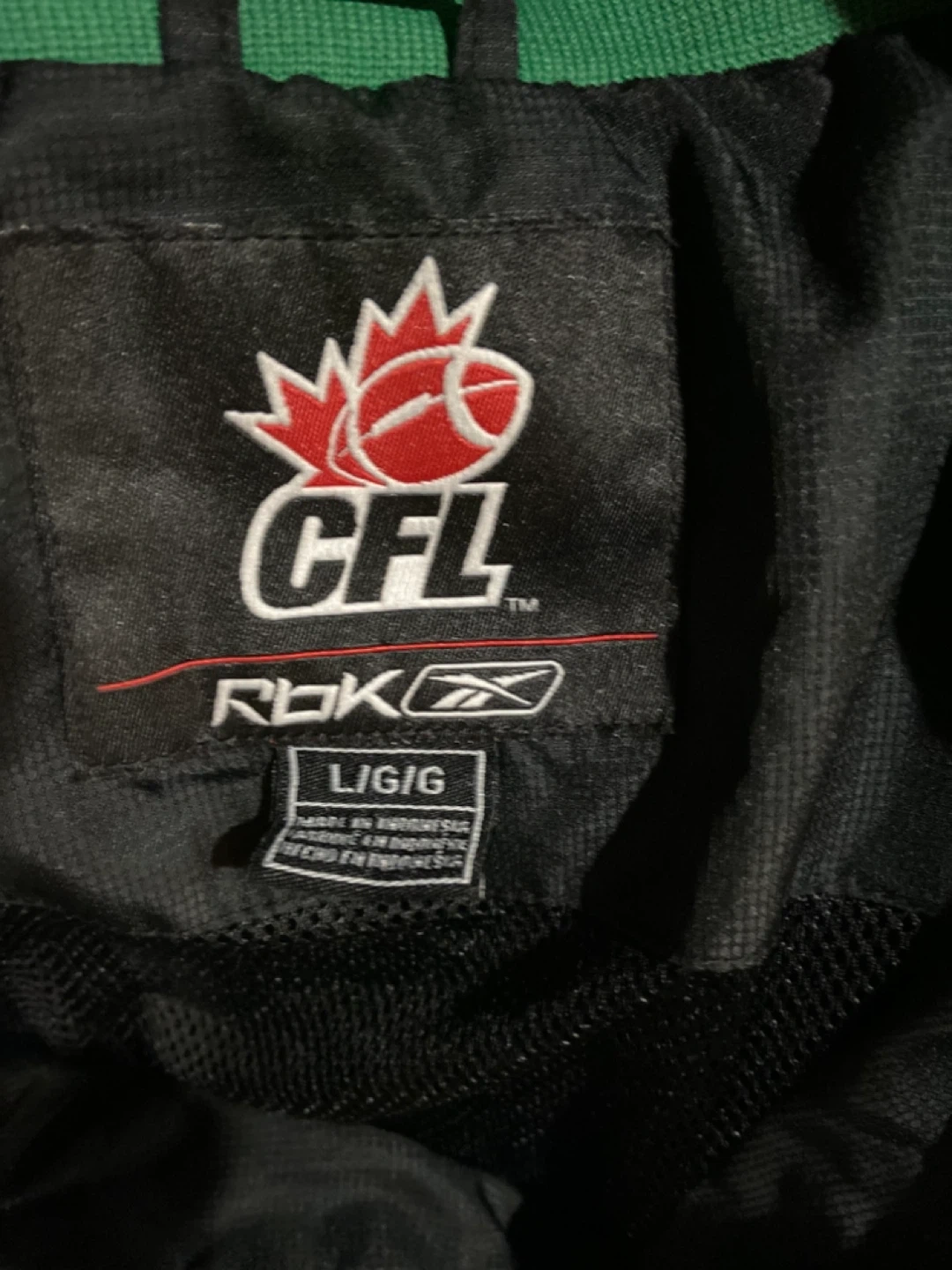 This is a black Reebok windbreaker jacket for the Saskatchewan Roughriders. It's a size L/G and made of nylon. Perfect for game days or casual wear! Asking 15