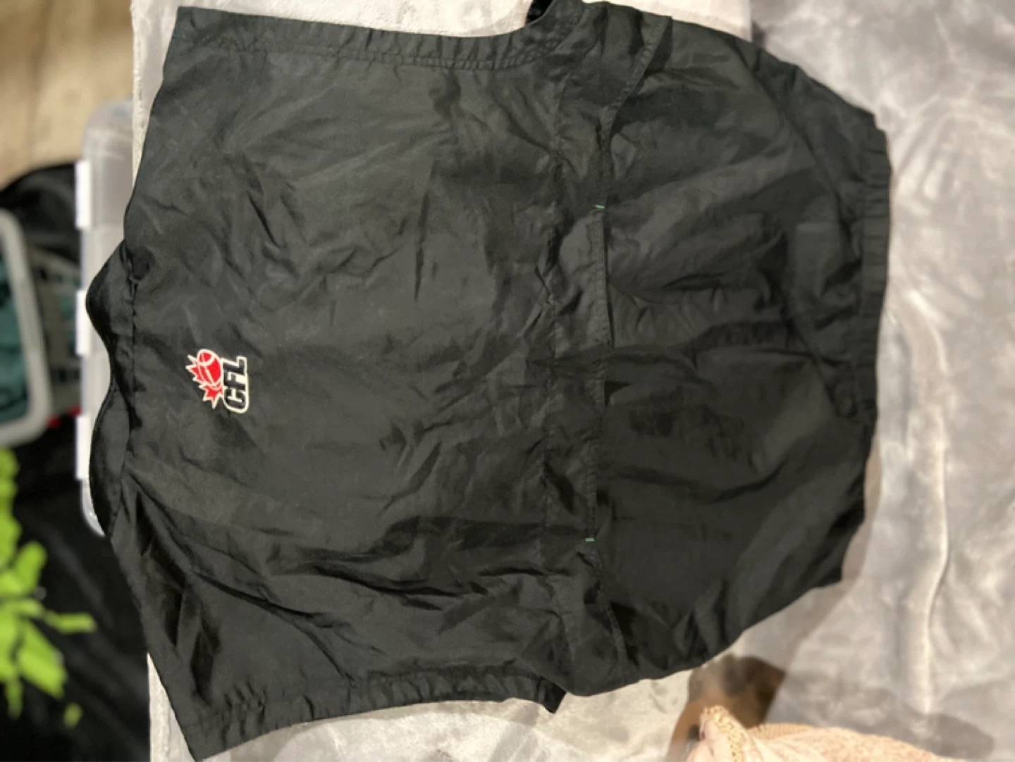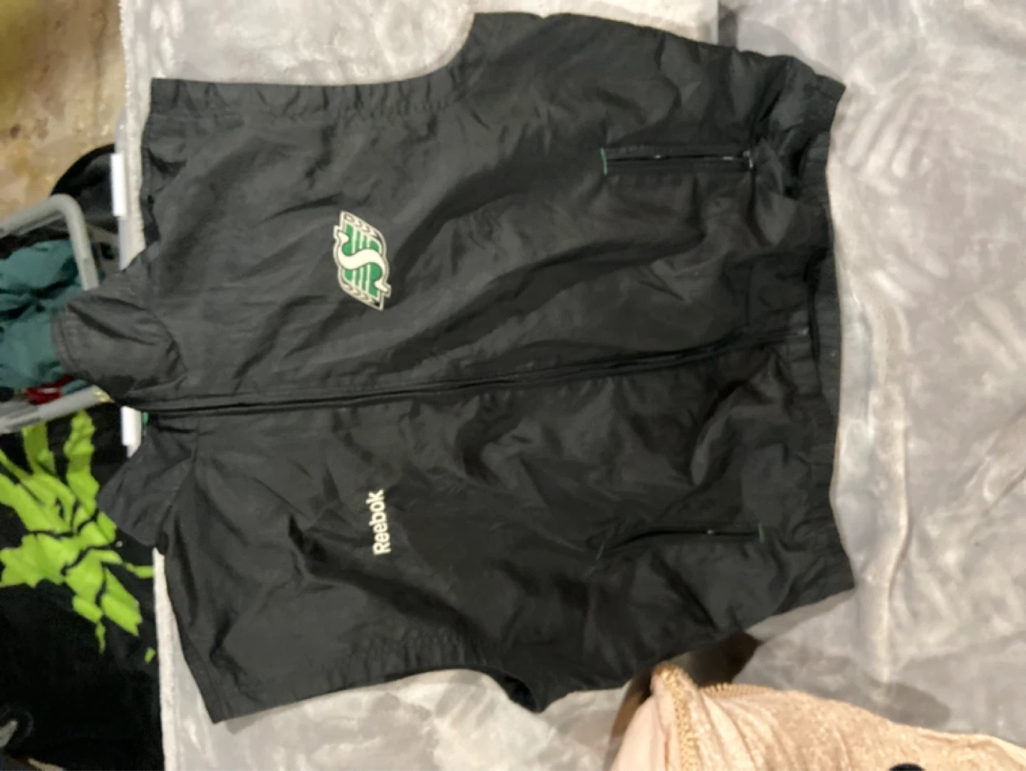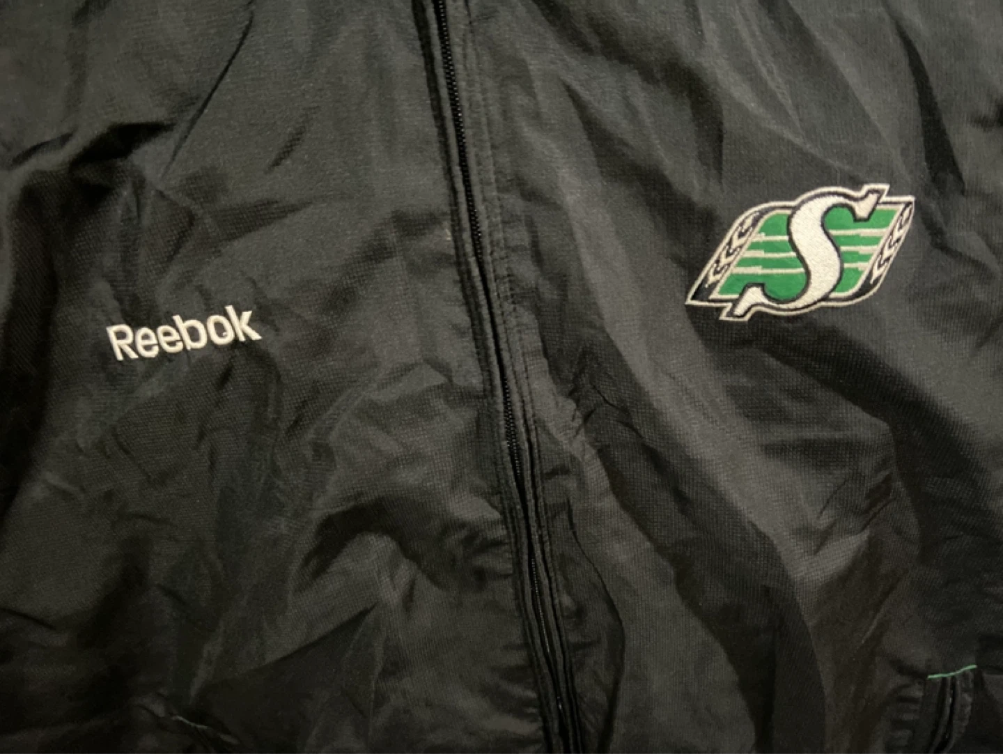 This is a black Reebok windbreaker jacket for the Saskatchewan Roughriders. It's a size L/G and made of nylon. Perfect for game days or casual wear! Asking 15