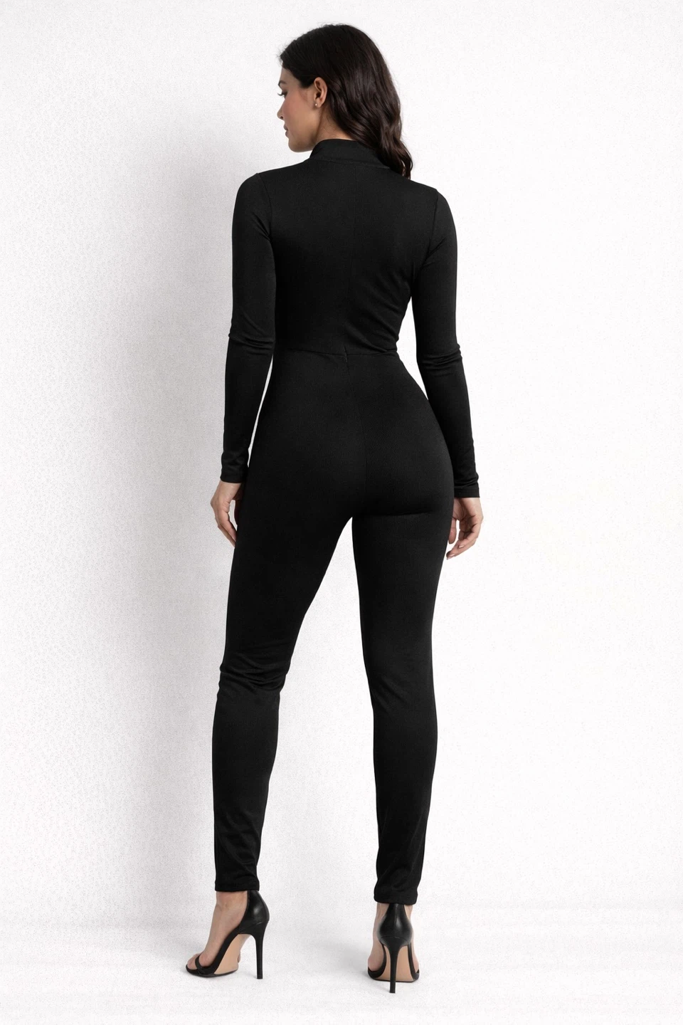 4 jumpsuits for sale. 3 black jumpsuits and 1 grey jumpsuit. All are form-fitting with a sleek silhouette. They're made from a stretchy ribbed material for comfort and style. Sizes range from small and medium large. Buy all for $30 or each for $15.