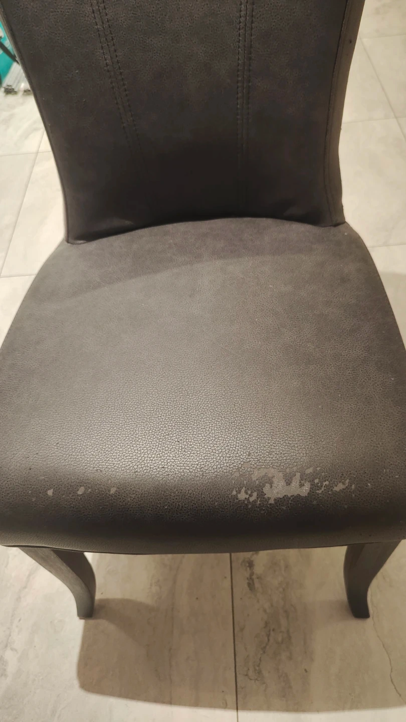 Selling a dark grey dining chair. It has a leather-like material and a curved back. There are some visible signs of wear on the seat, as shown in the pictures. It would be a great addition to any dining room or kitchen!