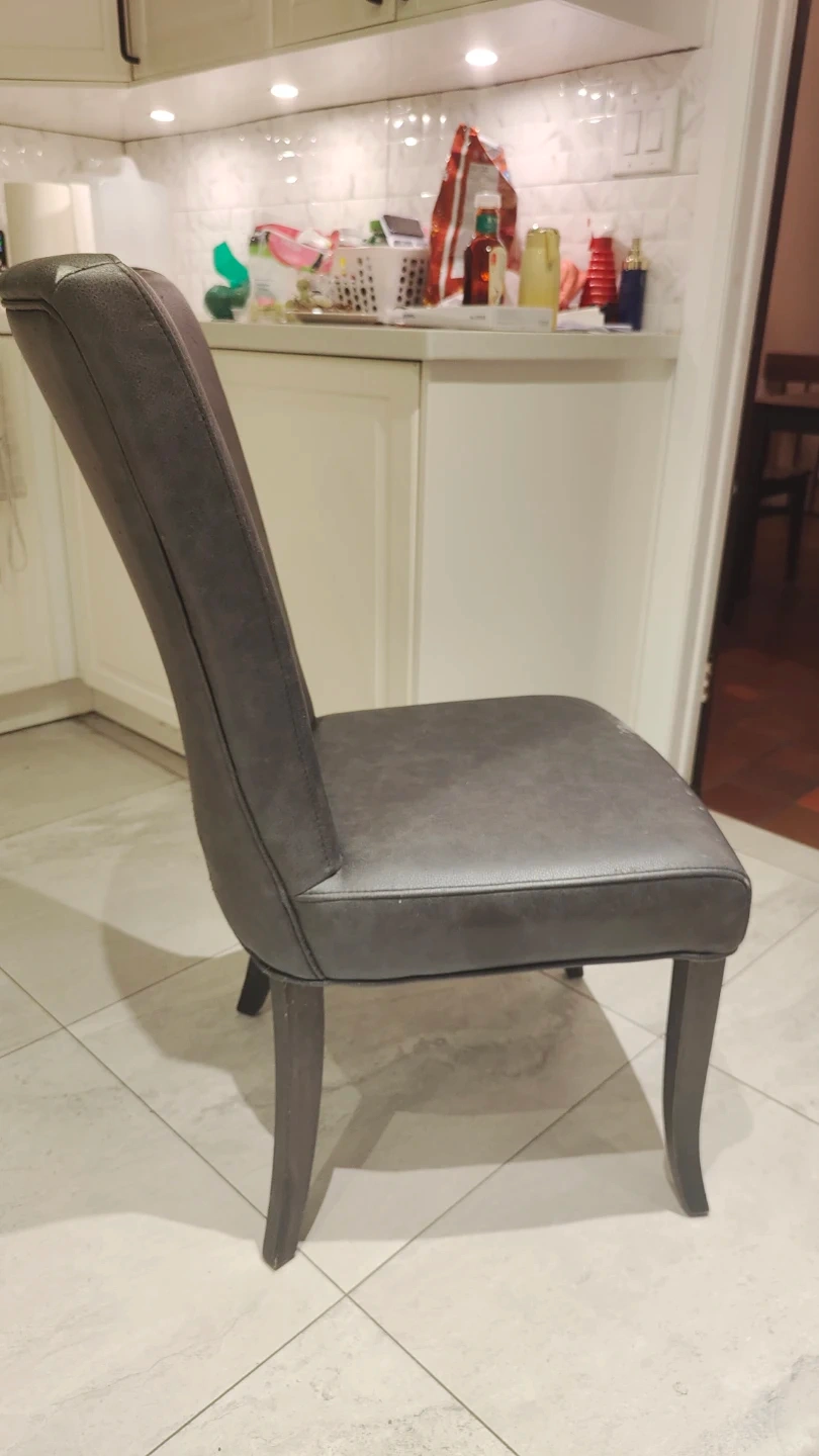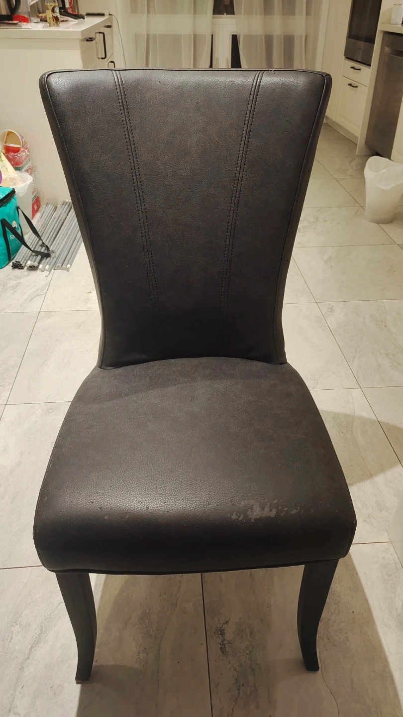 Selling a dark grey dining chair. It has a leather-like material and a curved back. There are some visible signs of wear on the seat, as shown in the pictures. It would be a great addition to any dining room or kitchen!