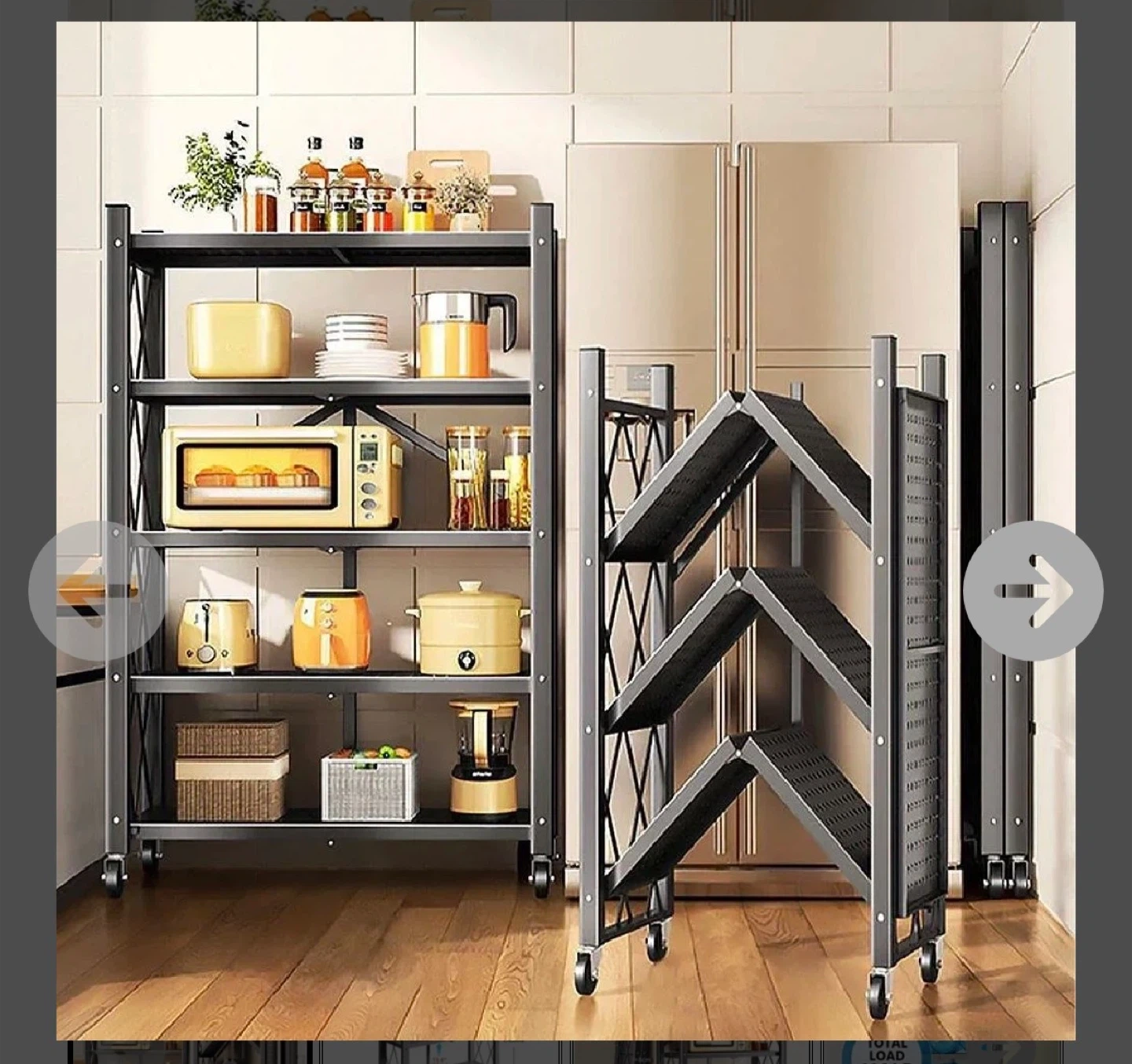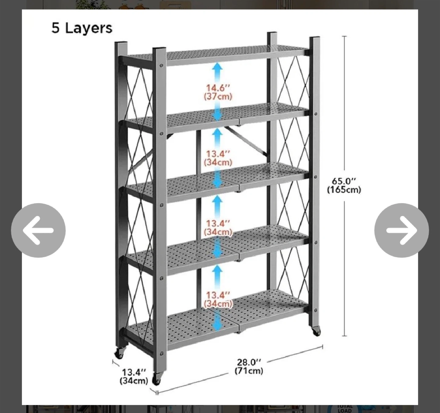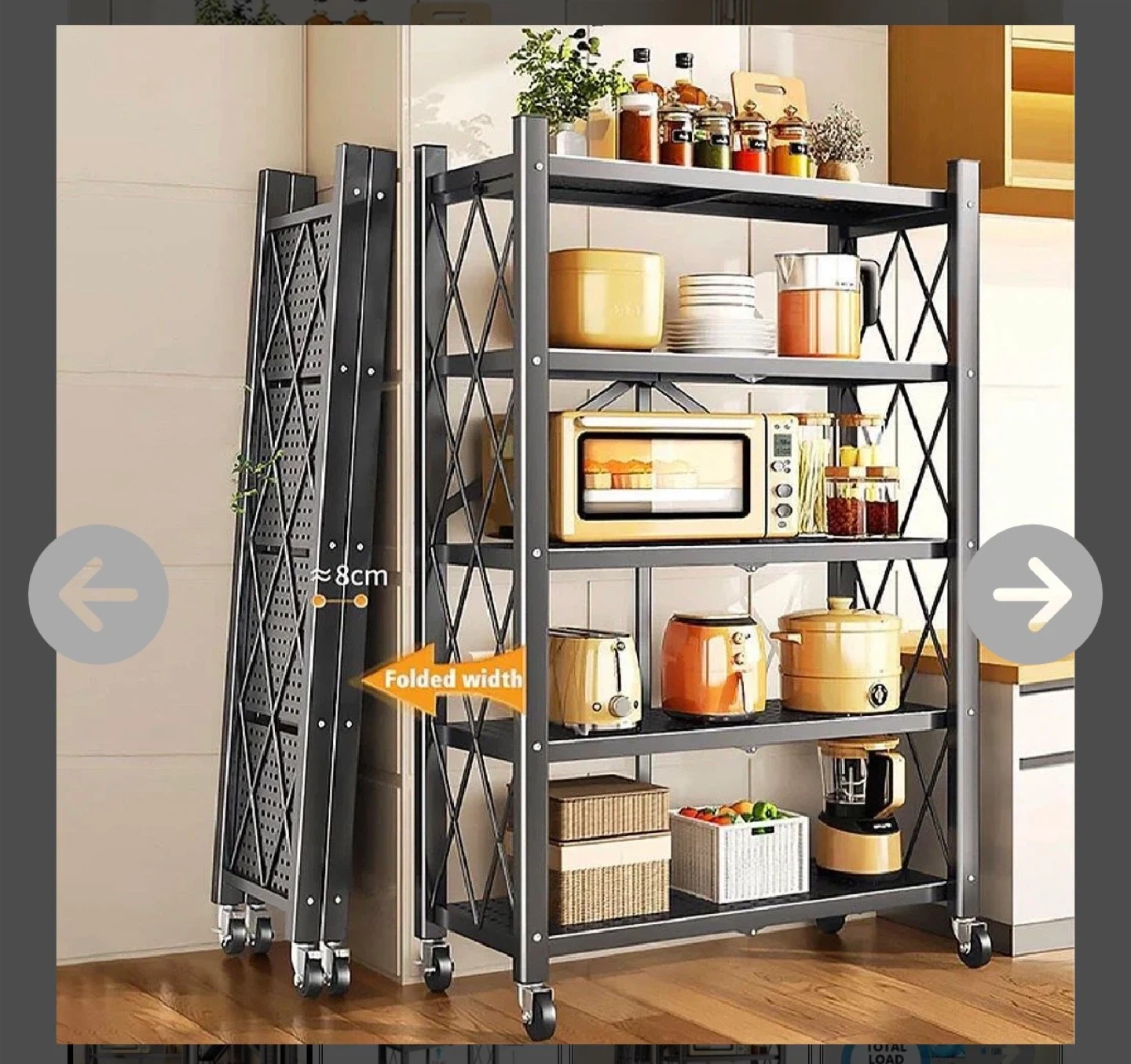 This is a 5-tier folding shelving unit. It's made of metal and features a perforated shelf design. The unit is on wheels for easy mobility. Its folded width is approximately 8cm.