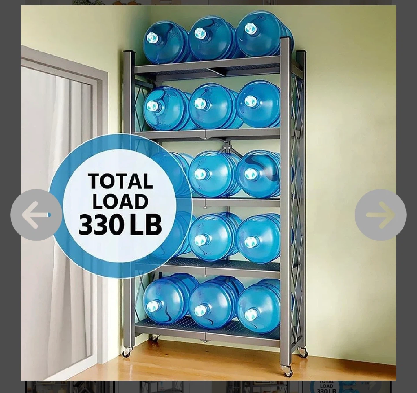 This is a 5-tier folding shelving unit. It's made of metal and features a perforated shelf design. The unit is on wheels for easy mobility. Its folded width is approximately 8cm.