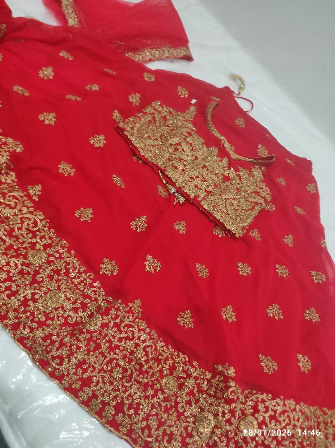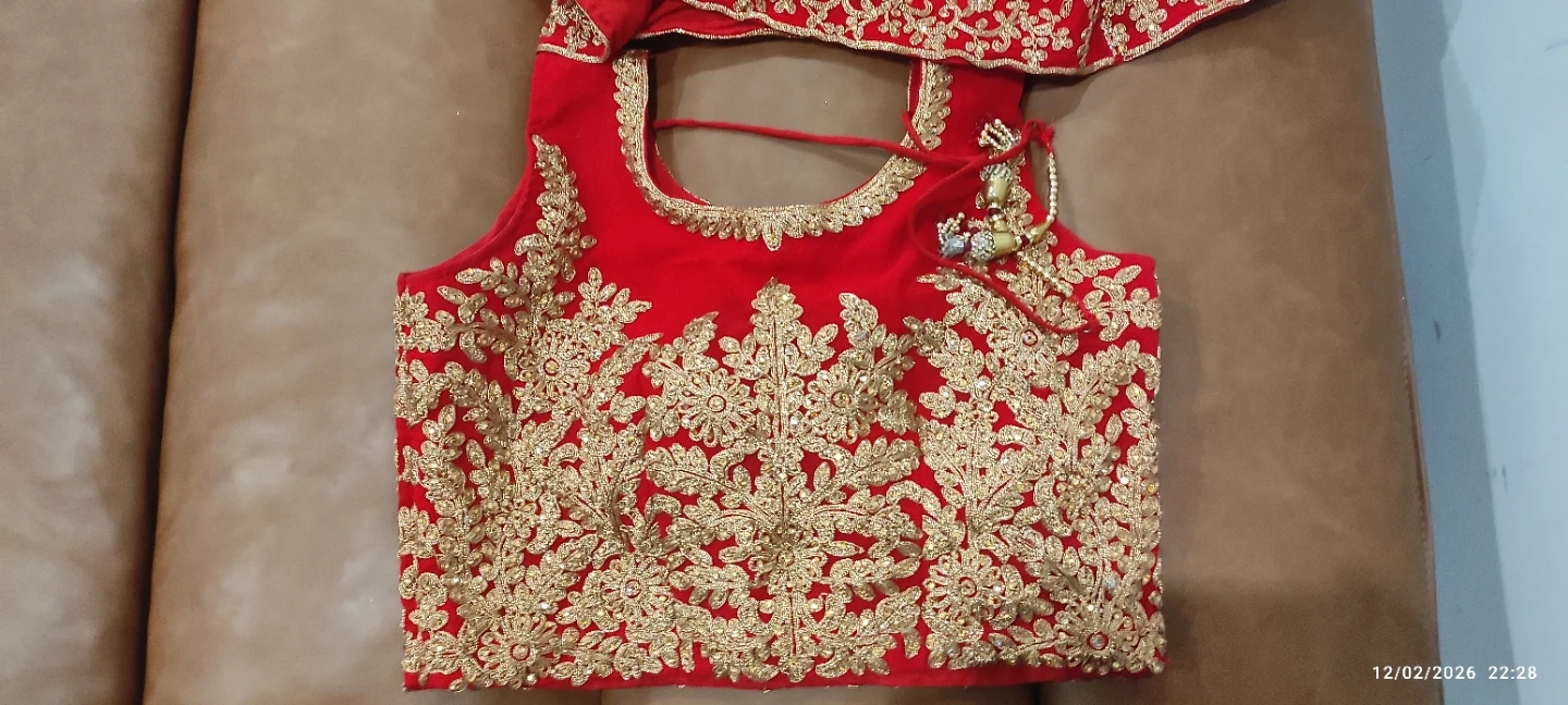 Beautiful red lehenga choli set with intricate gold embroidery. It includes a blouse, skirt, and dupatta. Perfect for special occasions!