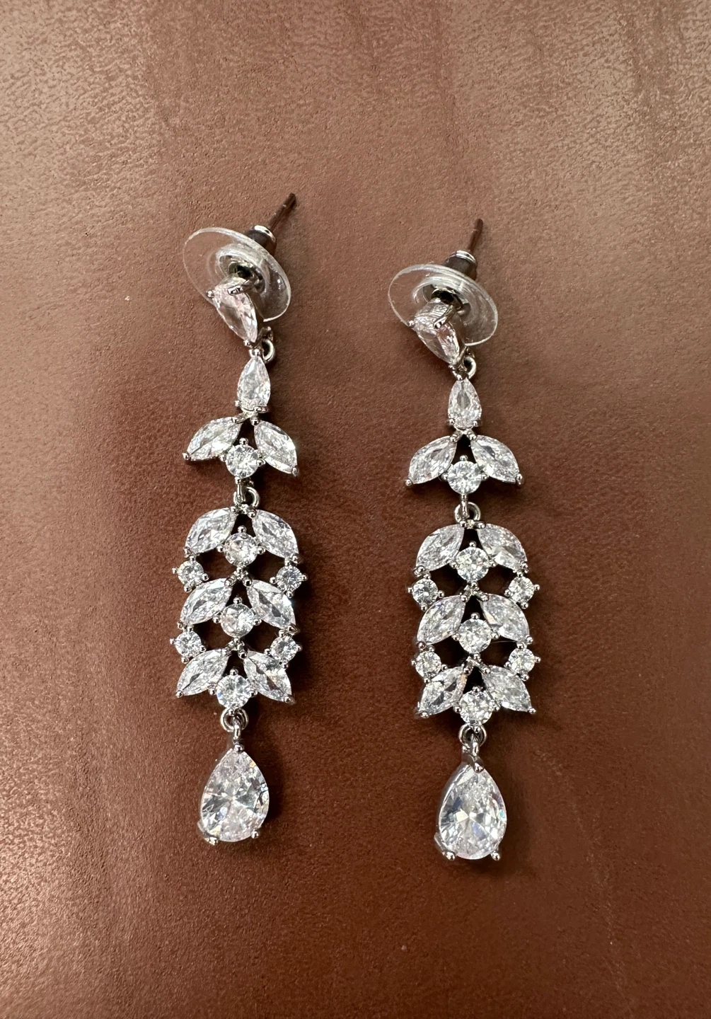 These elegant drop earrings are adorned with sparkling rhinestones in a teardrop and leaf design. They feature a silver-tone finish. These earrings are perfect for adding a touch of glamour to any outfit or for special occasions!