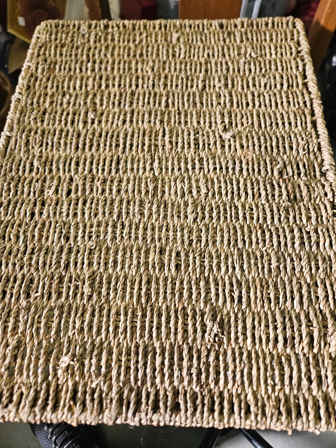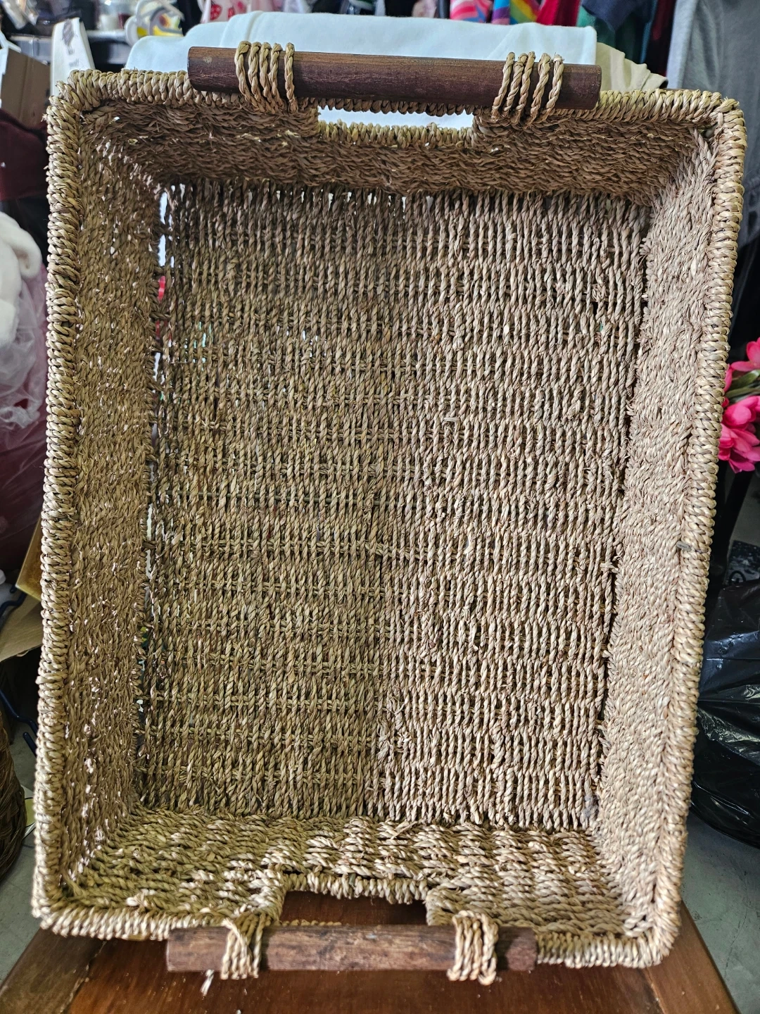 This is a rectangular woven storage basket with sturdy wooden handles. It's made from natural fibres and is perfect for organizing anything around the house. Use it for blankets, toys, or craft supplies!