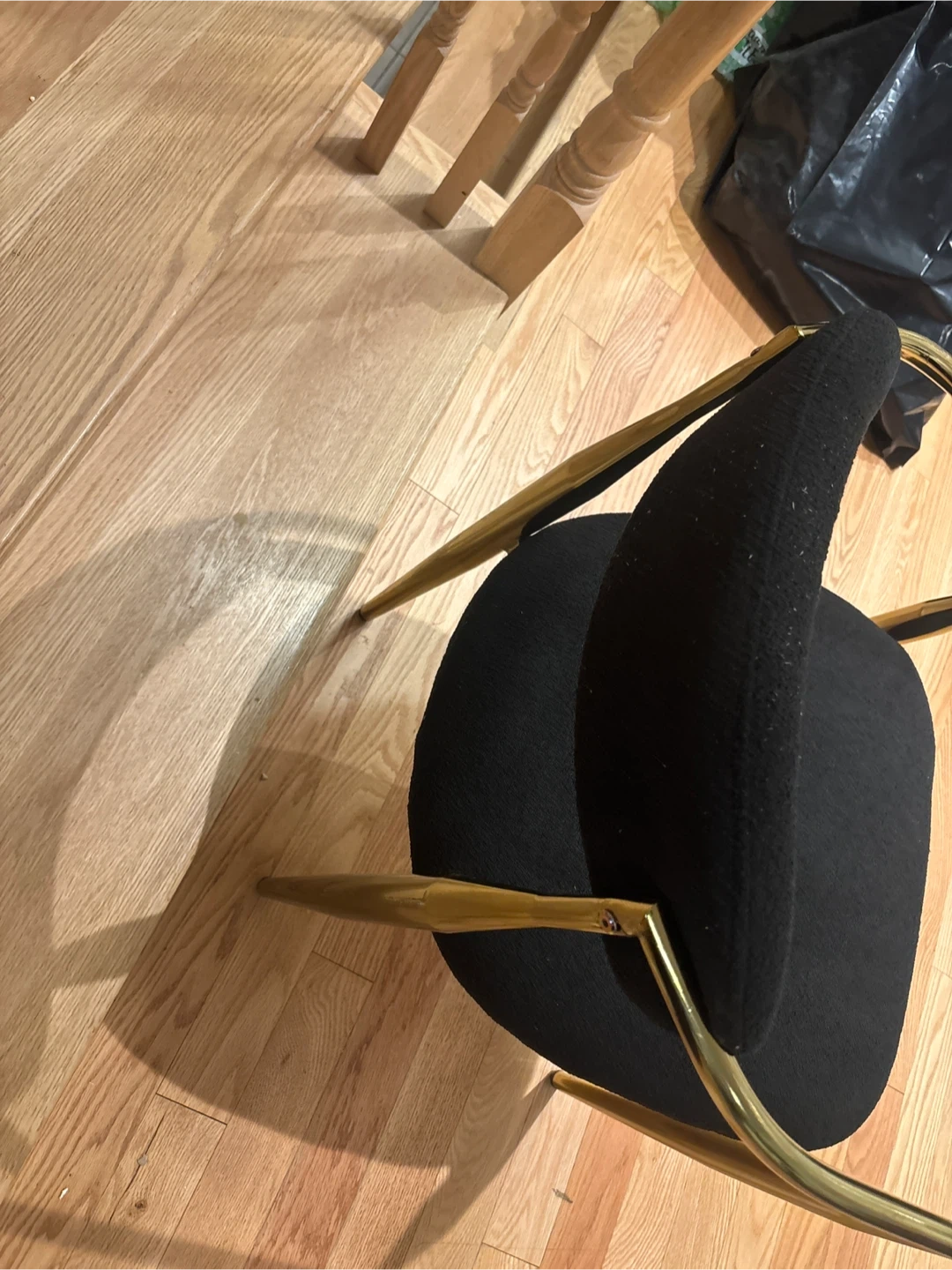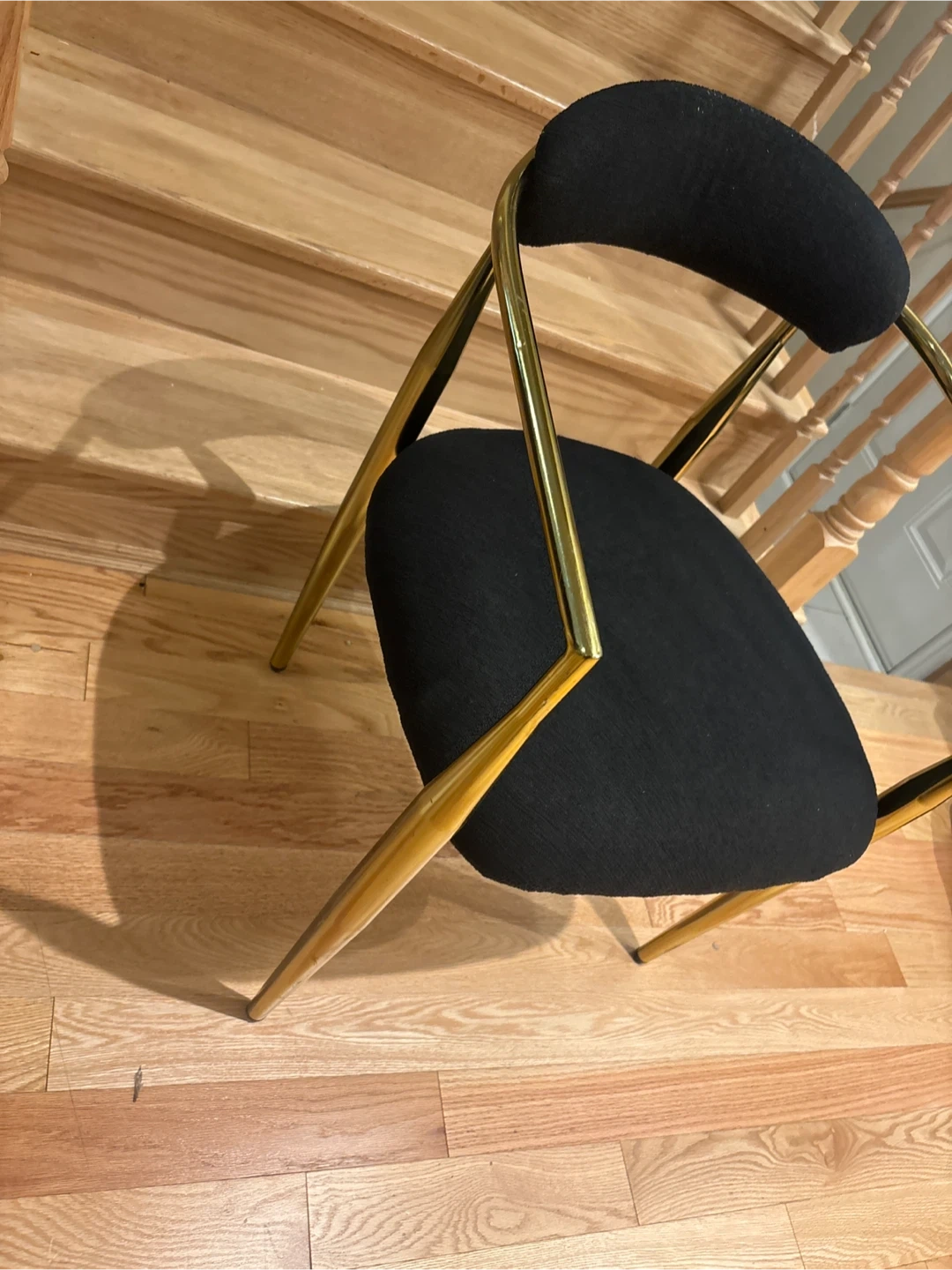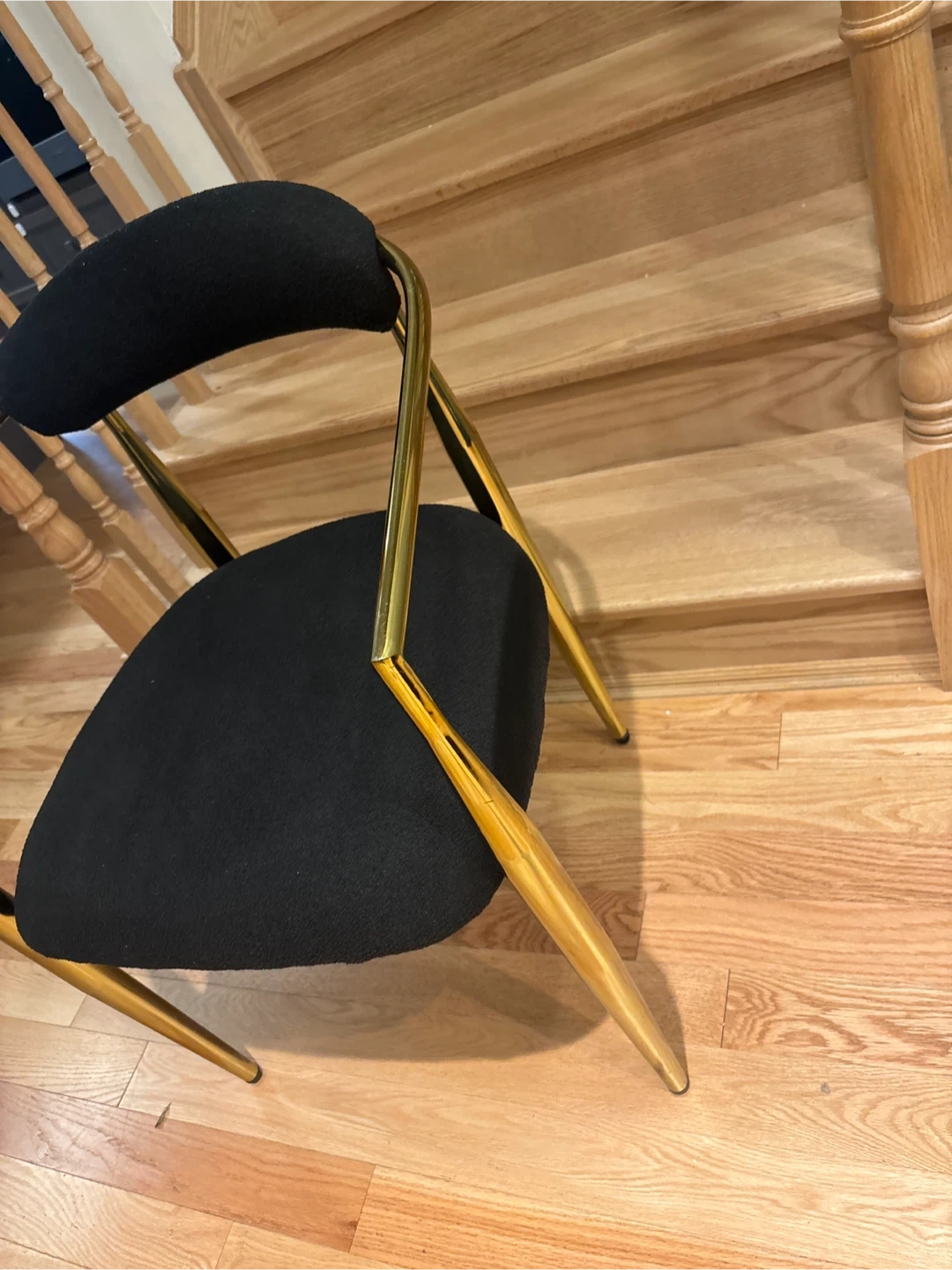 This accent dining chair features a comfortable black fabric seat and backrest. It's supported by a stylish gold-tone metal frame with unique angled legs. This chair would be a chic addition to a living room or entryway.Just 1 available
