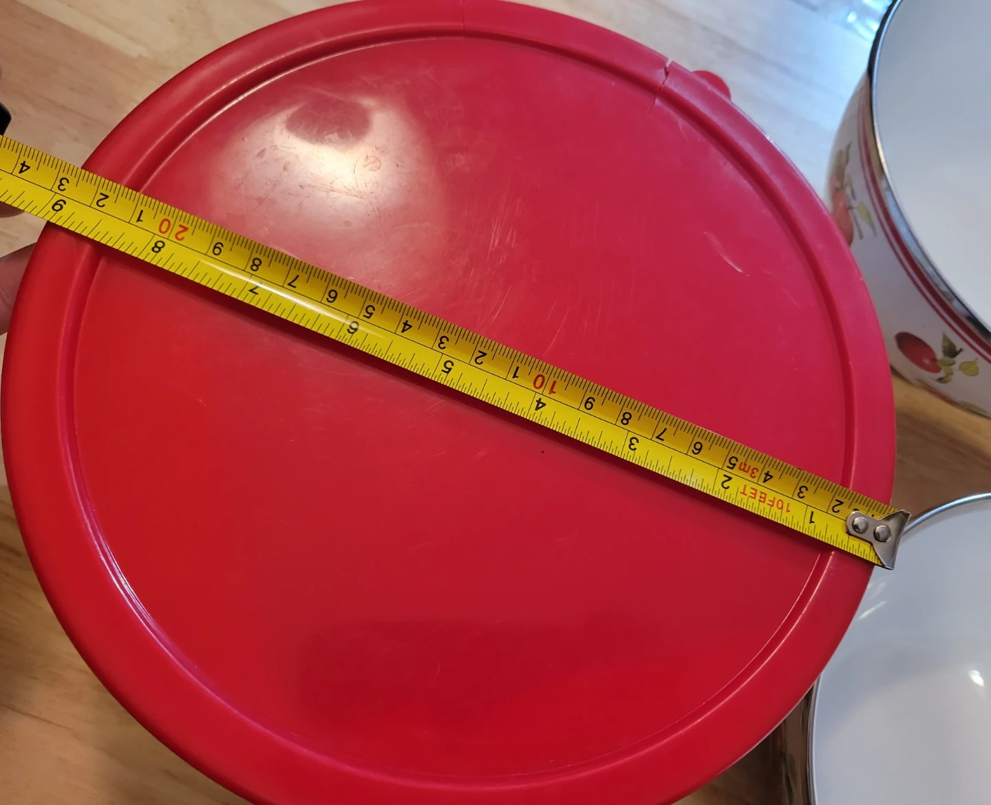 This set includes five vintage enamelware mixing bowls, each featuring a cheerful cherry design. Only three bowls have lids. The biggest lid has cracks (see photos).