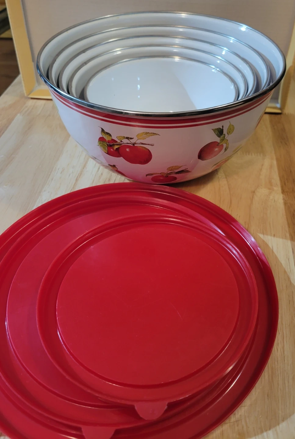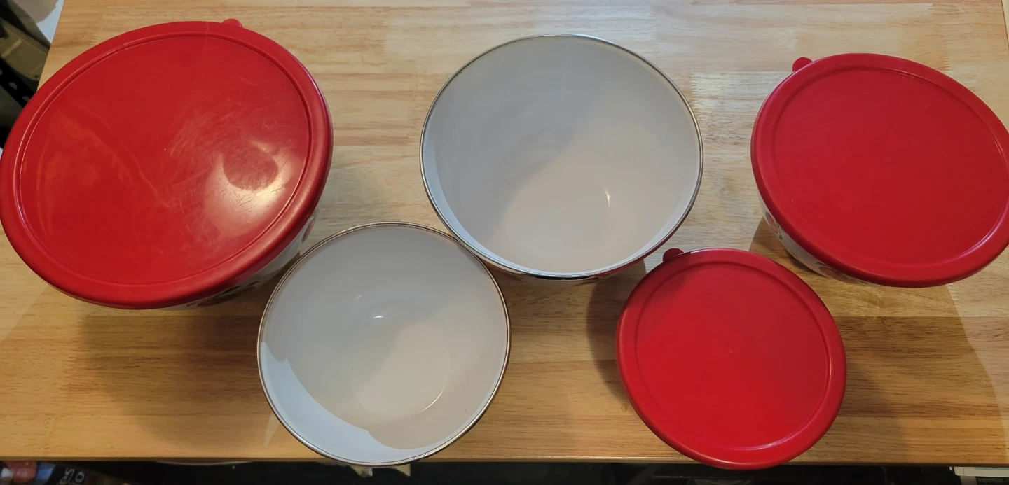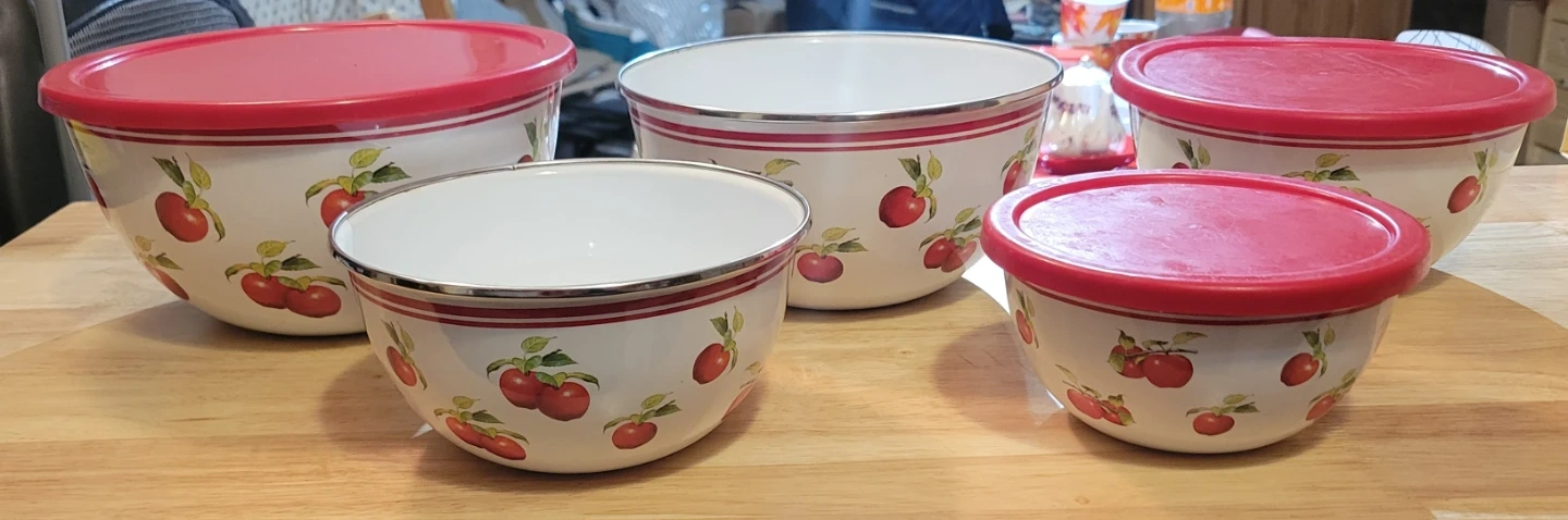 This set includes five vintage enamelware mixing bowls, each featuring a cheerful cherry design. Only three bowls have lids. The biggest lid has cracks (see photos).