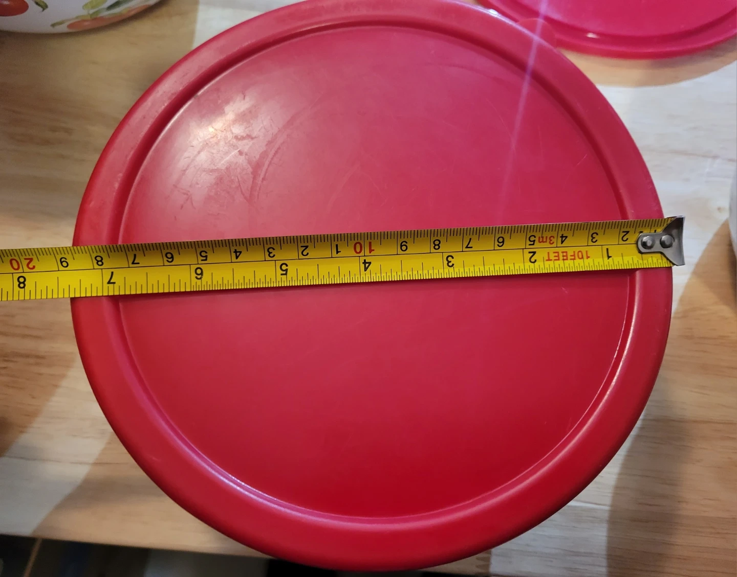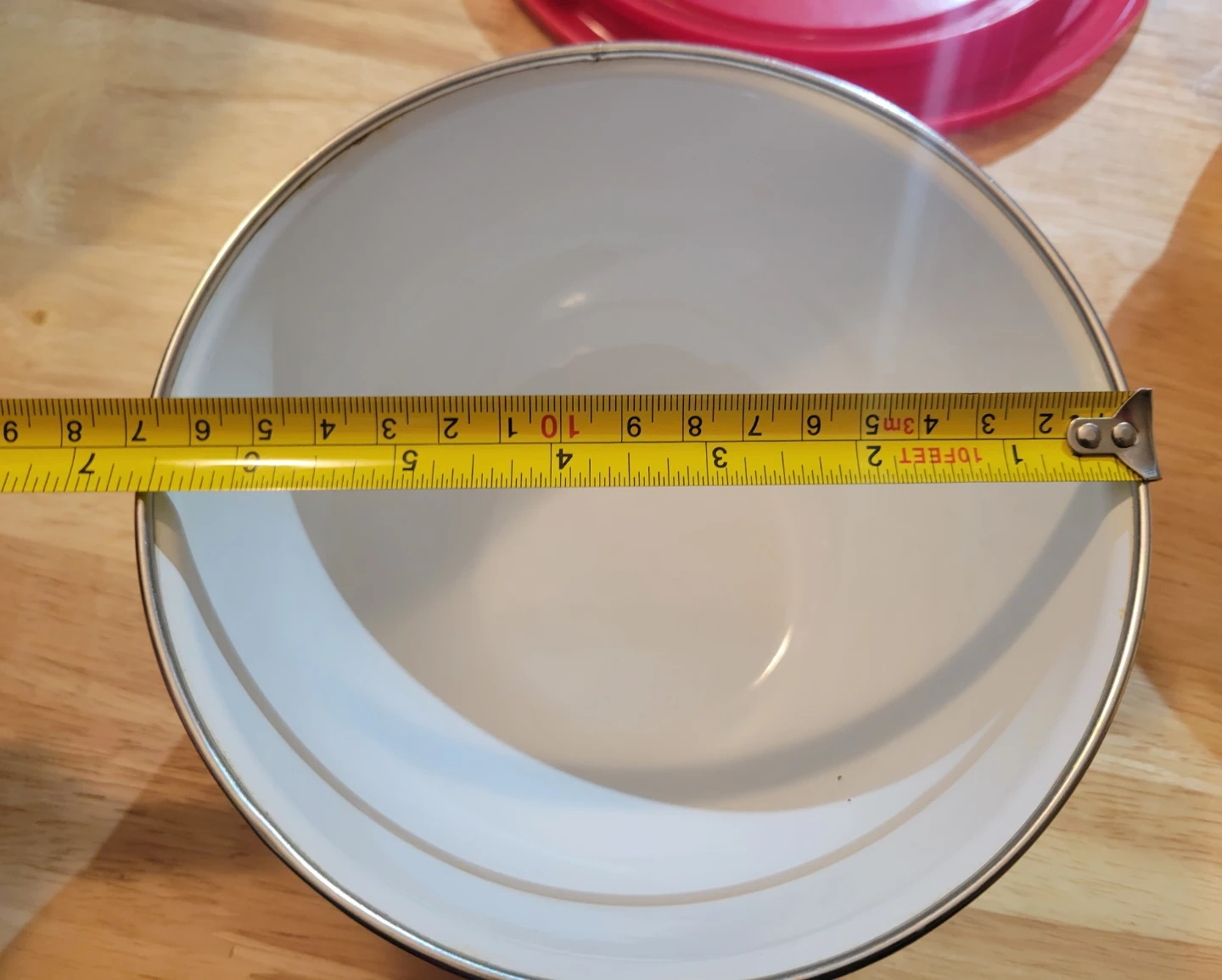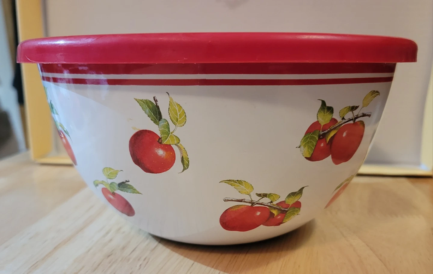 This set includes five vintage enamelware mixing bowls, each featuring a cheerful cherry design. Only three bowls have lids. The biggest lid has cracks (see photos).
