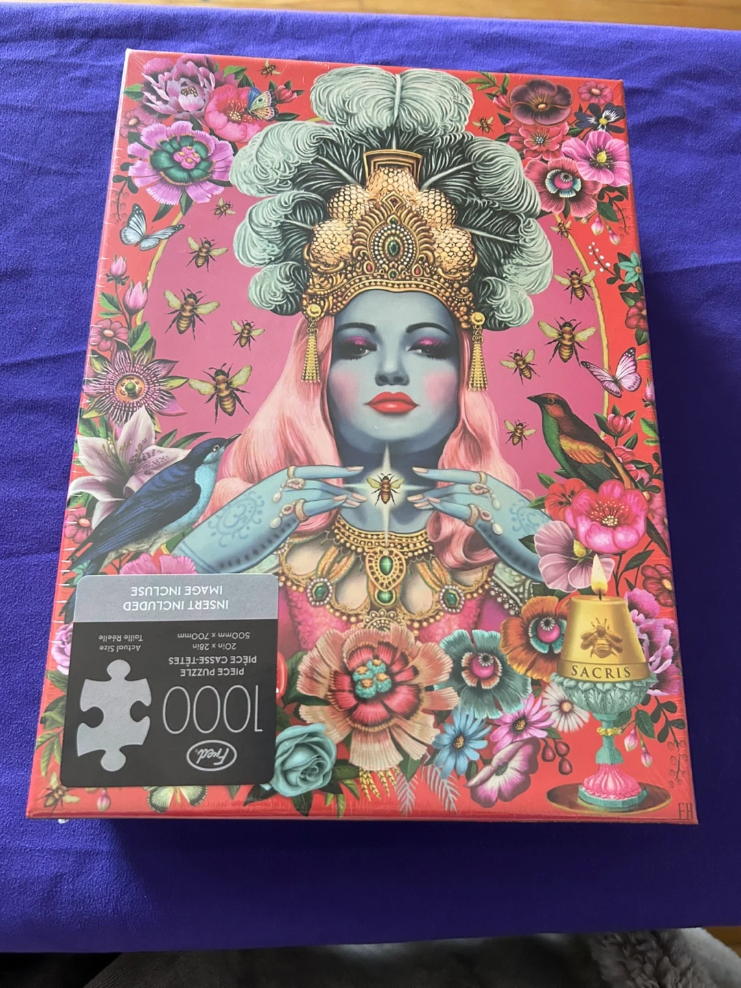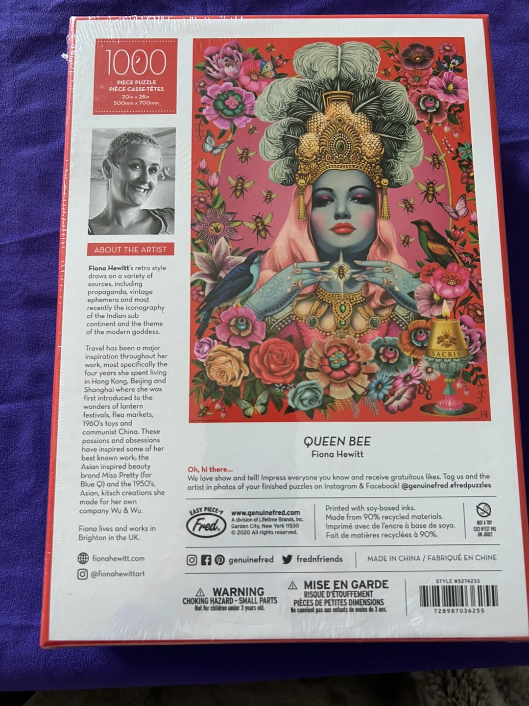 This 1000-piece jigsaw puzzle features Fiona Hewitt's 'Queen Bee' artwork. Puzzle dimensions are 20in x 28in. It's made from 90% recycled materials. A great choice for puzzle enthusiasts!
