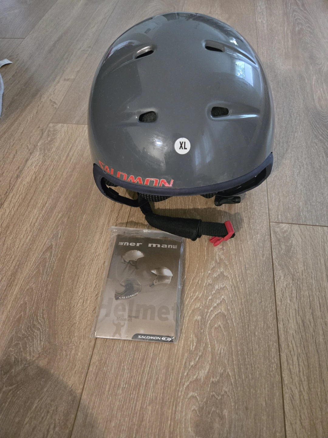 This is a Salomon ski and snowboard helmet in size XL. It's a grey helmet that comes with an owner's manual. Great for staying safe on the slopes!