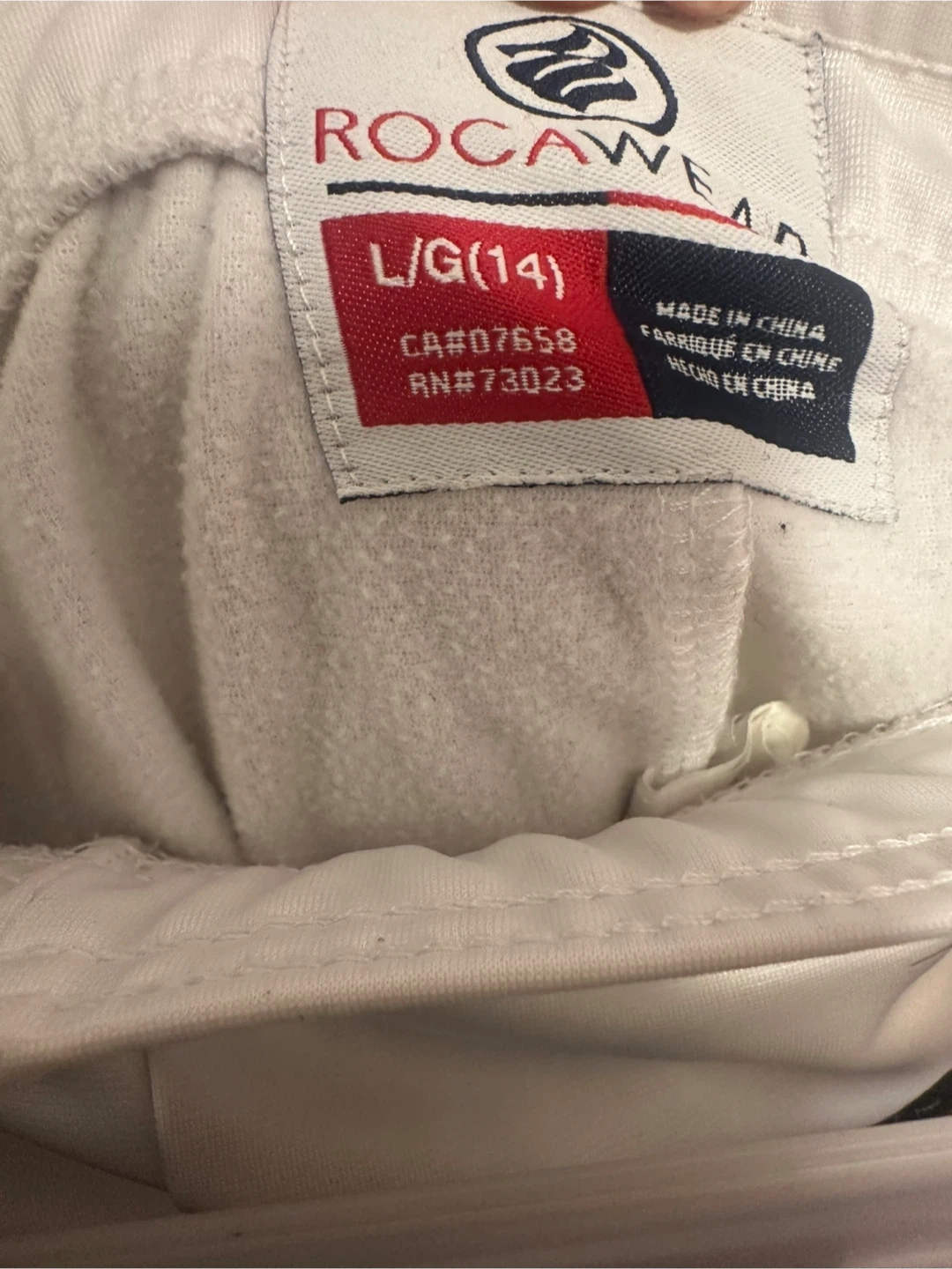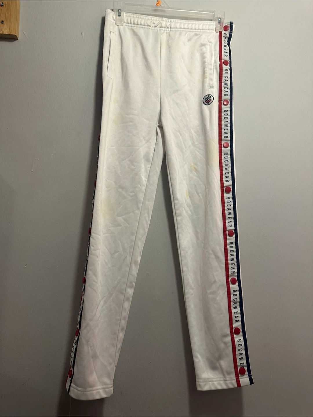 White Rockwear track pants with snap buttons down the sides. Features the brand name printed along the stripes. Size L/G (14).