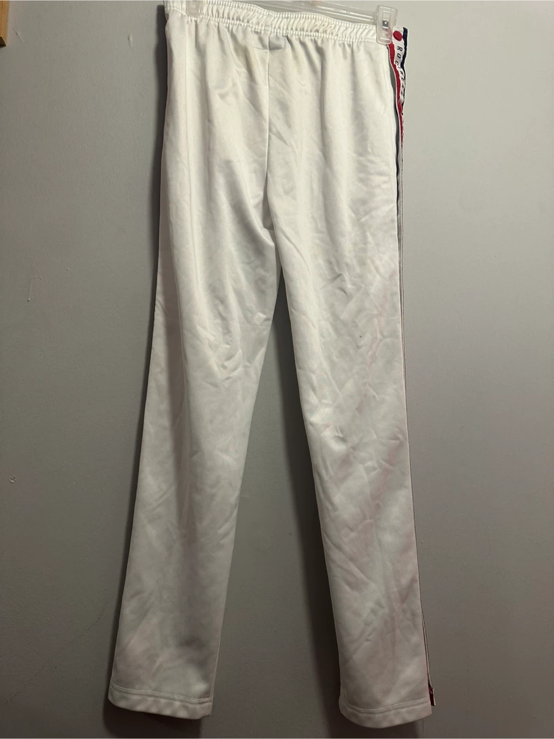 White Rockwear track pants with snap buttons down the sides. Features the brand name printed along the stripes. Size L/G (14).
