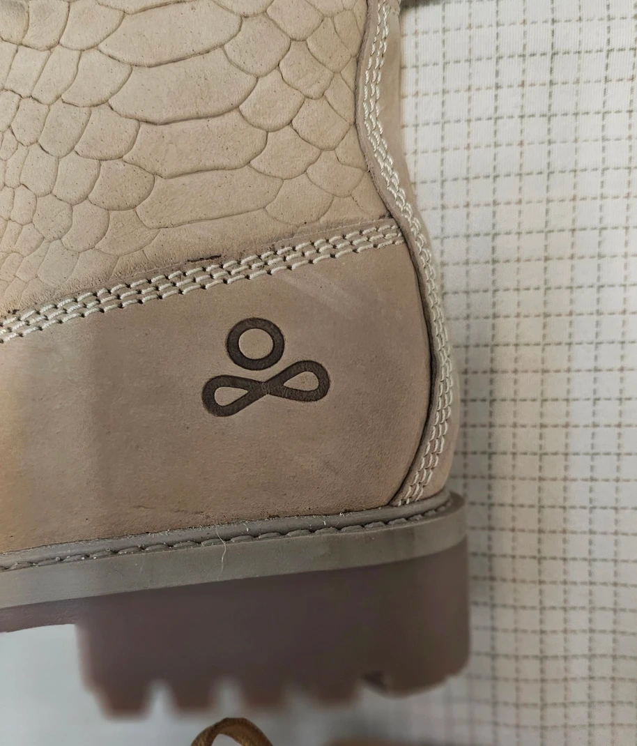 Selling a pair of SoftMoc ankle boots in a lovely beige colour. They are a size 7. The boots feature a unique snakeskin-like texture on the sides and have a sturdy lug sole, perfect for fall and winter!