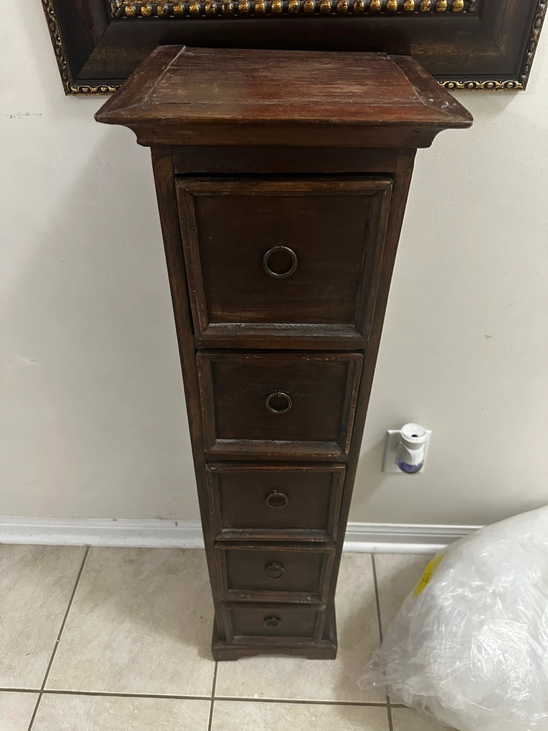 Selling a dark wood accent table with five drawers. It's perfect for adding a touch of rustic charm to any room.