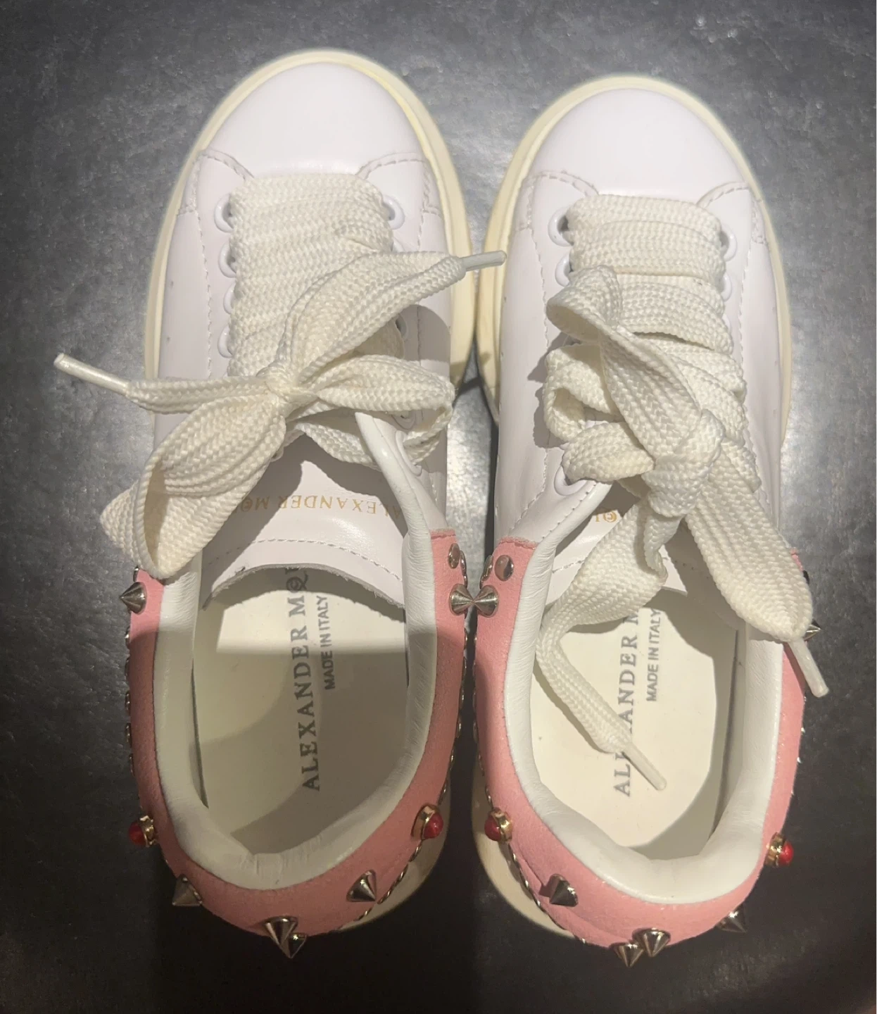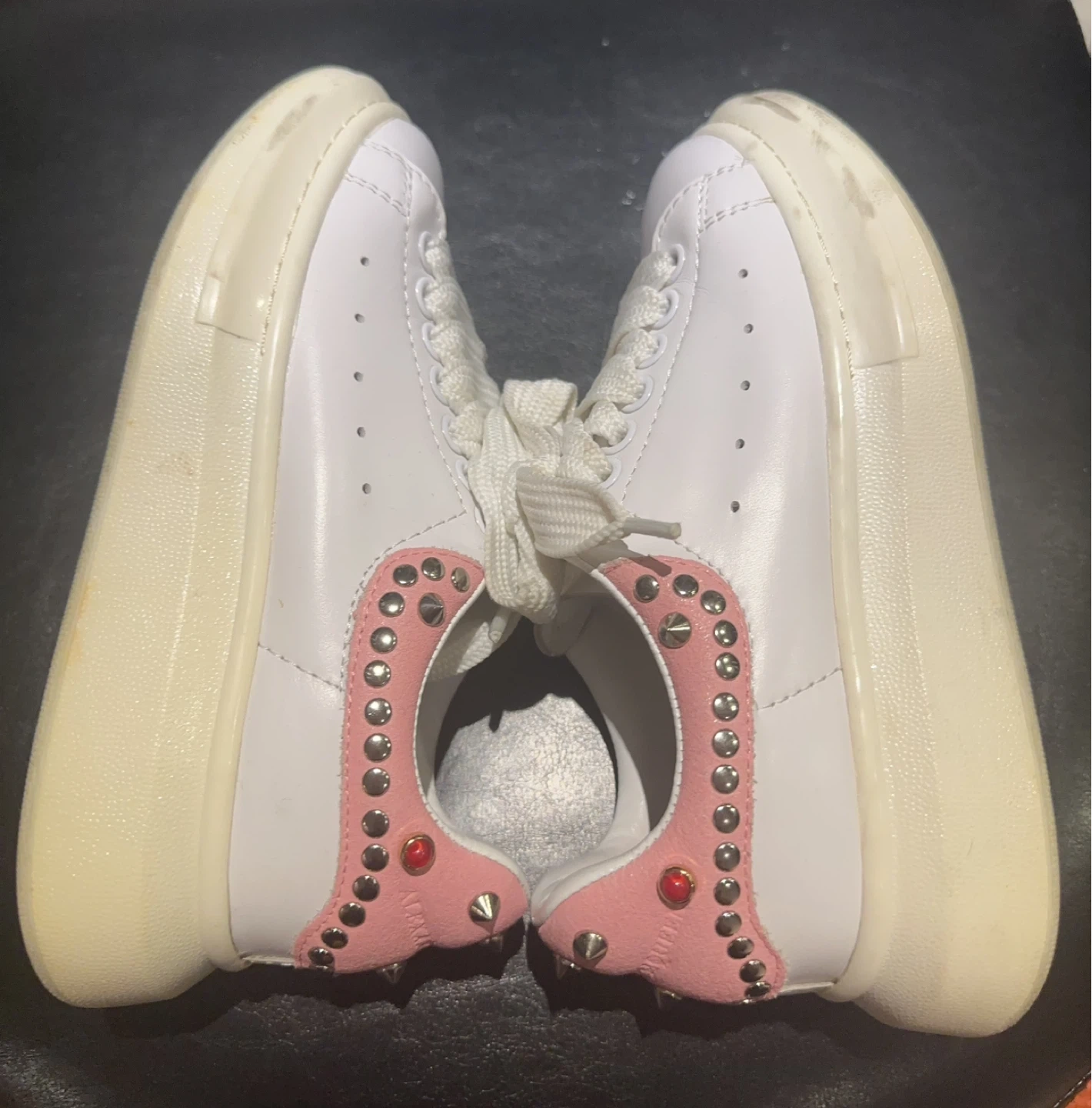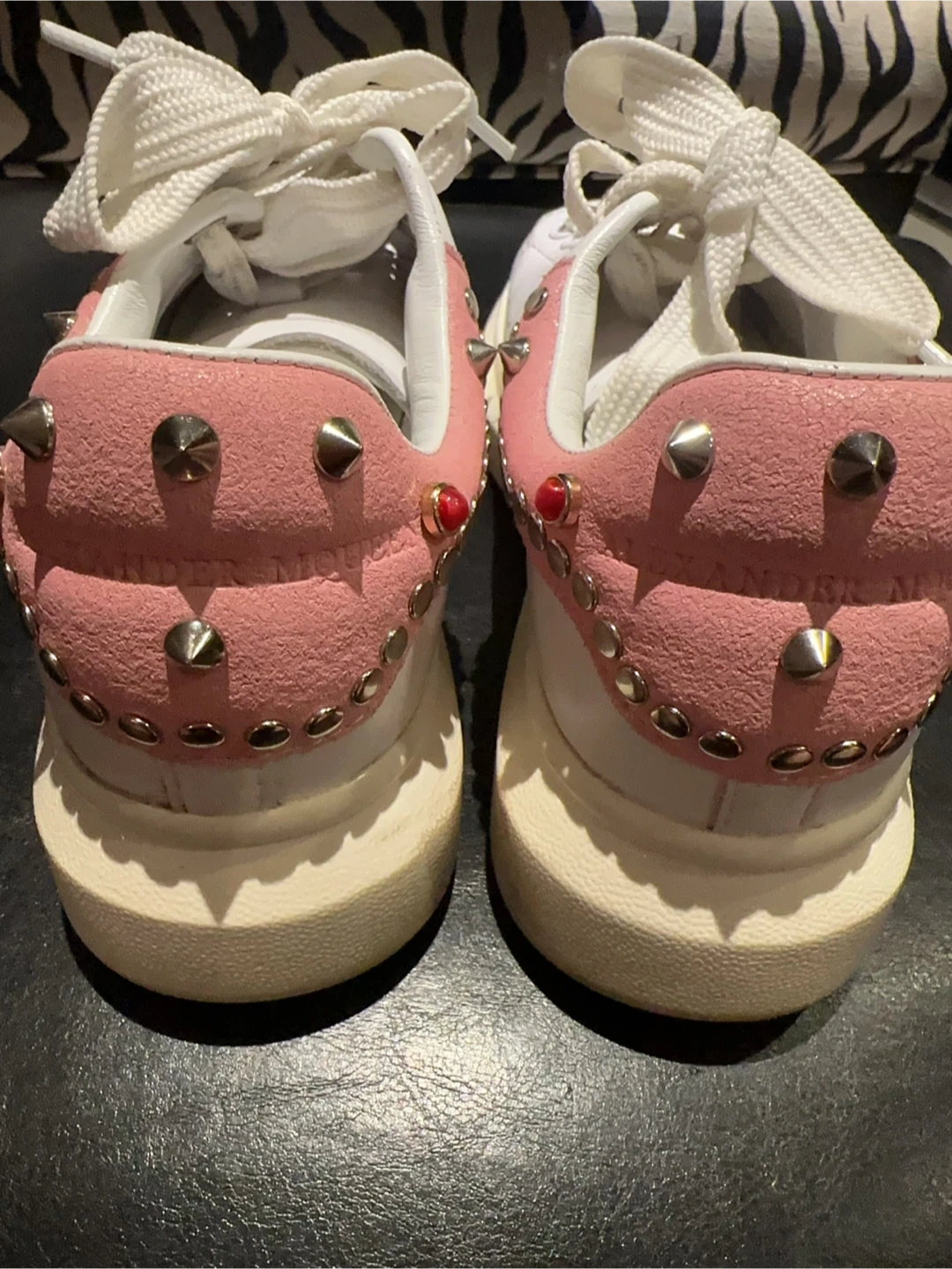 Alexander McQueen sneakers featuring a white leather upper and pink suede detailing with silver studs and red gem accents. Made in Italy. Platform sole.
