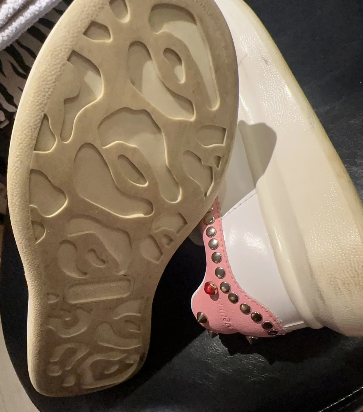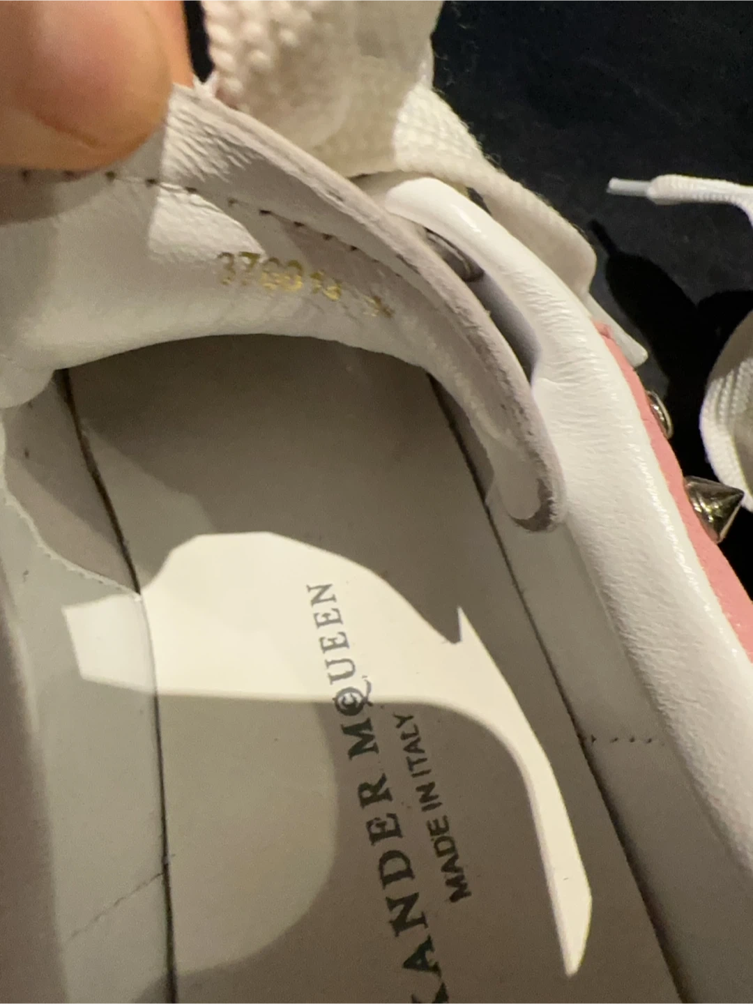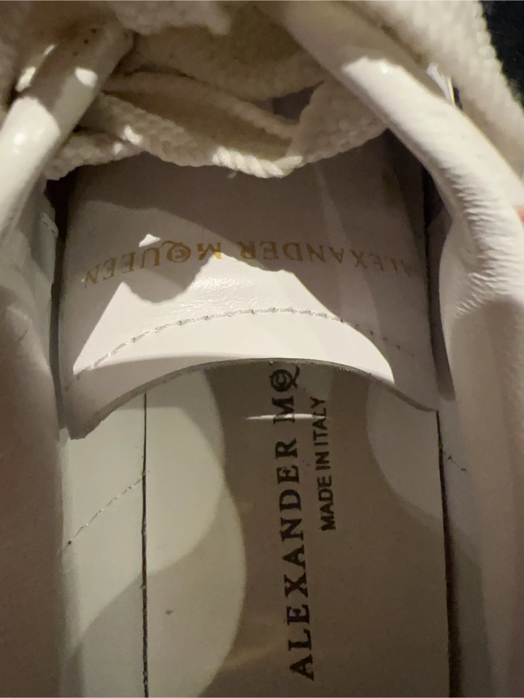 Alexander McQueen sneakers featuring a white leather upper and pink suede detailing with silver studs and red gem accents. Made in Italy. Platform sole.