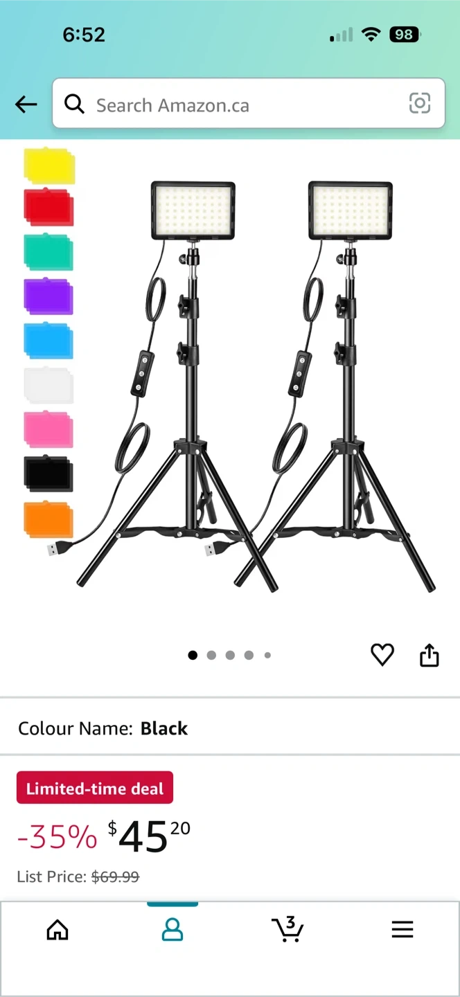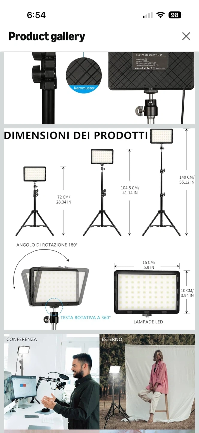 This set includes two LED photography lights with adjustable tripods. Each light measures 15 cm x 10 cm and has 70 beads. They offer adjustable brightness levels. Perfect for streaming, photography, or video recording!