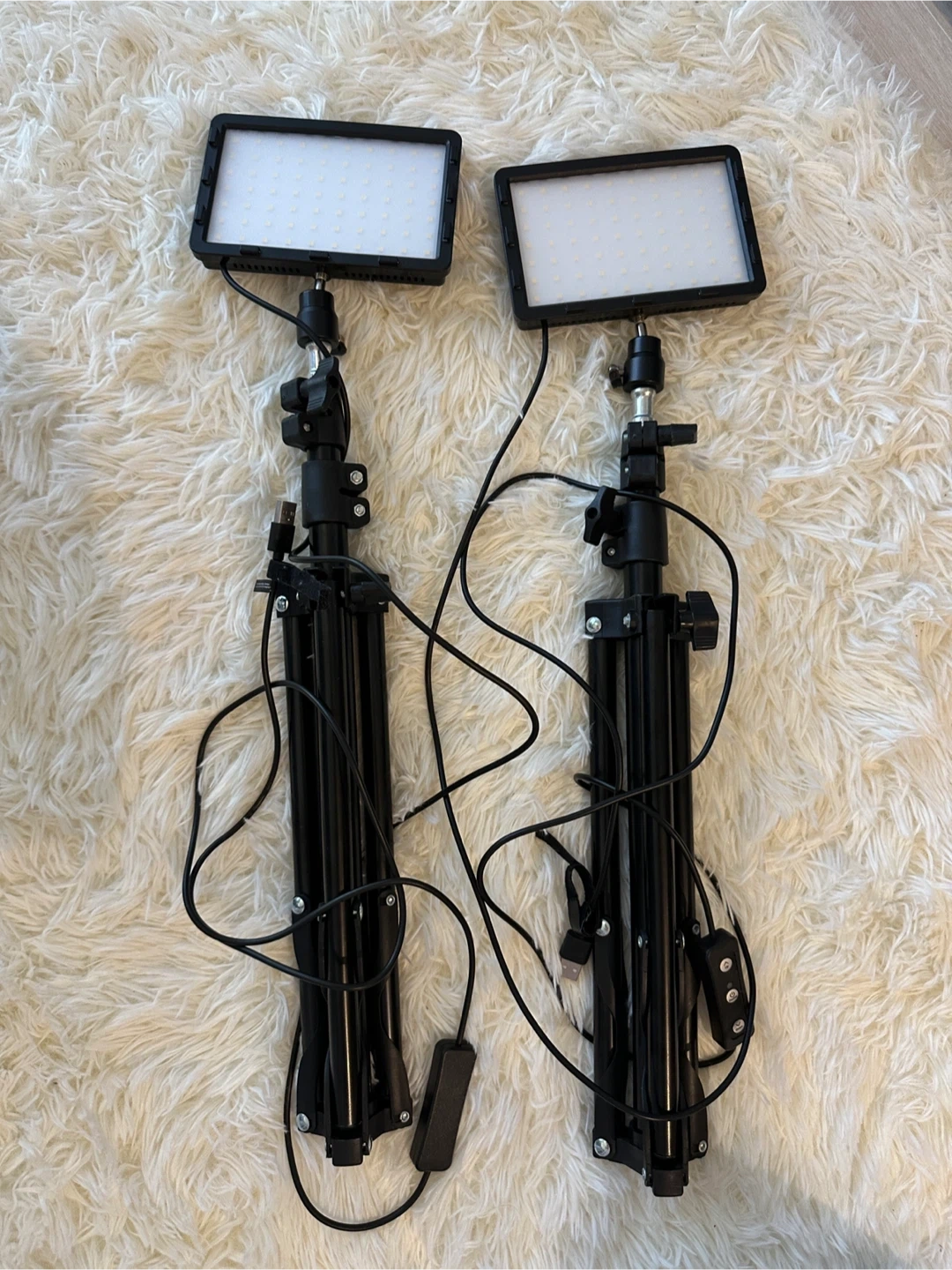 This set includes two LED photography lights with adjustable tripods. Each light measures 15 cm x 10 cm and has 70 beads. They offer adjustable brightness levels. Perfect for streaming, photography, or video recording!