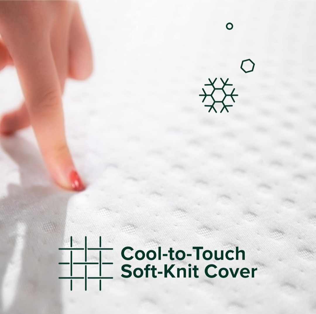 8-inch mattress featuring CertiPUR-US certified foam. Cool-to-touch soft knit cover. Durable and dependable foam layers. Thermoregulatory knitted jacquard cover.