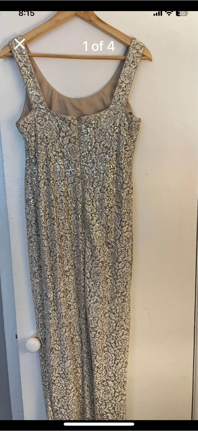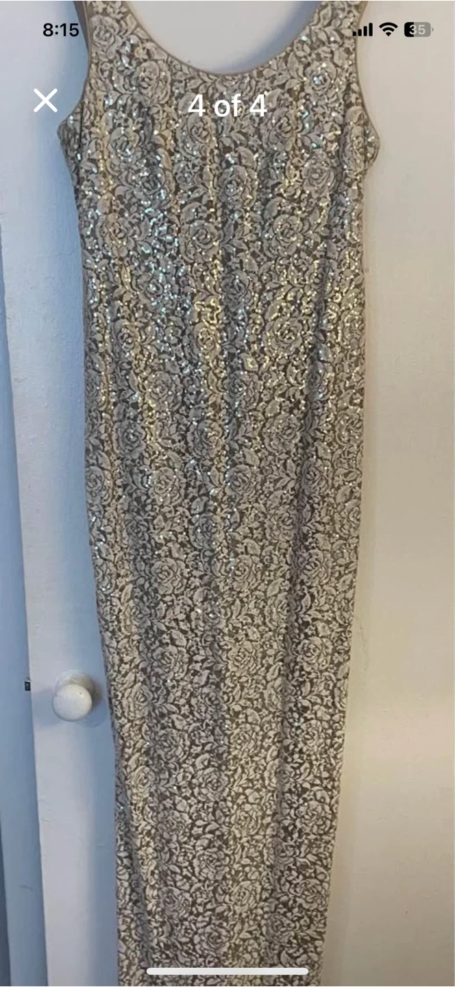 This elegant gown features a delicate lace overlay with sparkling sequin embellishments. It has a sleeveless design and a flattering silhouette with a subtle side slit. It's perfect for special occasions like weddings or formal events!