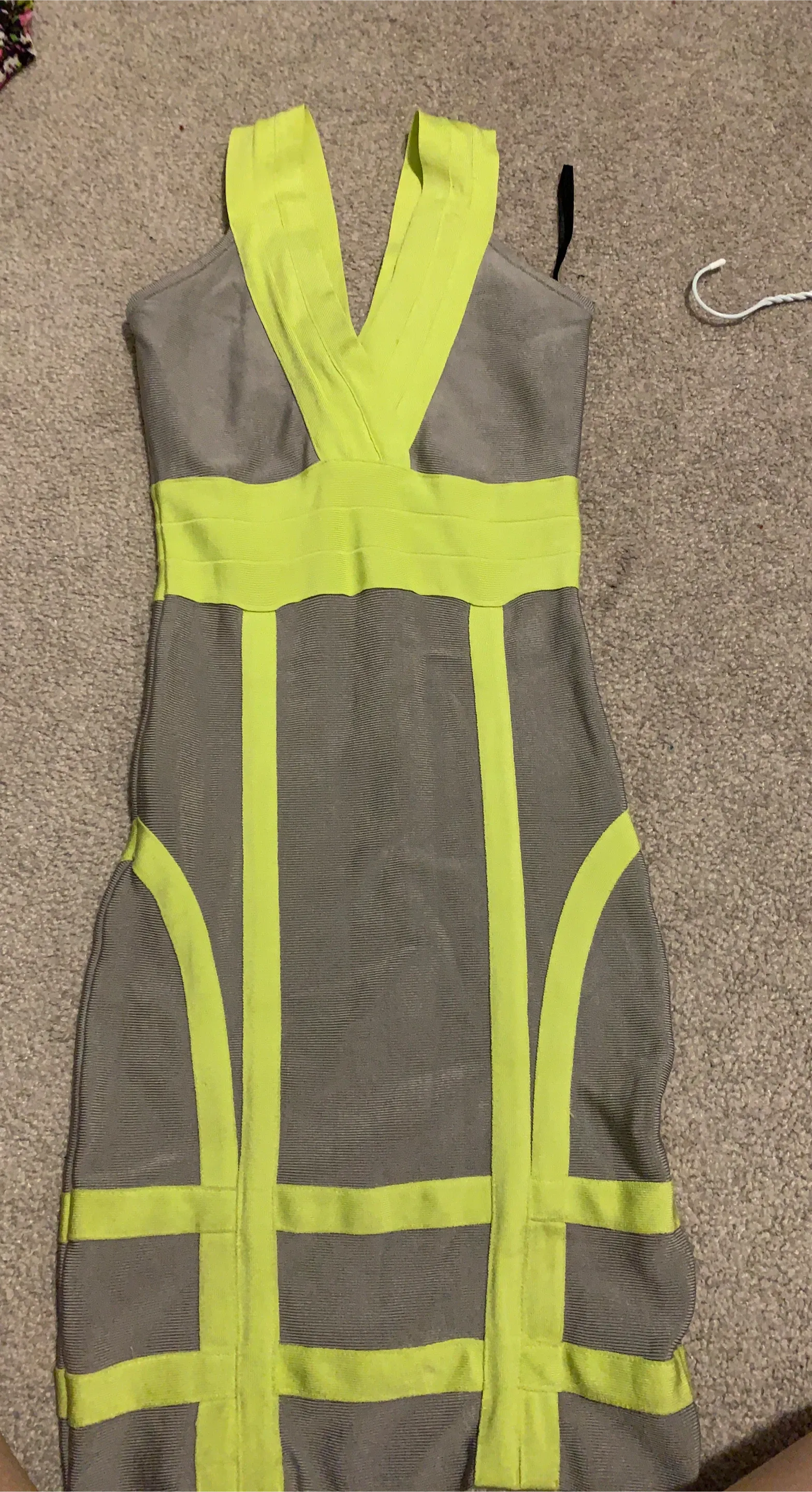 Selling a grey dress with neon yellow accents! It's in great condition and would be perfect for a night out or a special occasion. The material is stretchy and comfortable