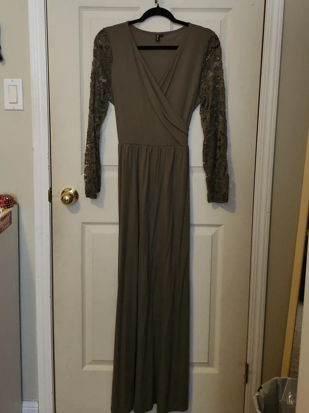 This olive green maxi dress features a flattering wrap-style bodice and elegant lace long sleeves. It's made from a comfortable, stretchy fabric with a defined waist. A great choice for dressing up or down!