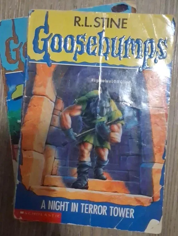 This is Goosebumps 'A Night in Terror Tower' by R.L. Stine. It's a thrilling read for young horror fans. The book is published by Scholastic.