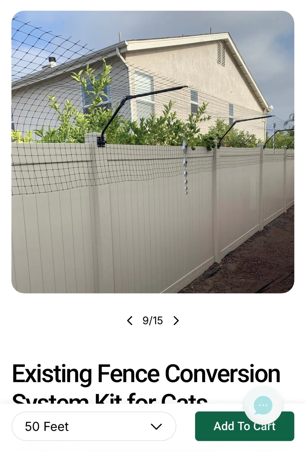 This system includes 50 feet of freestanding fence, plus 50 feet to convert an existing fence into a cat-proof enclosure. It features a pivoting spring-loaded arm that removes a cat's ability to climb over the fence. It's designed to keep your feline friends safely contained within your yard. Comes with 48 inch heavy duty gate and hog ring gun +2500 hog rings to make installation faster. Brand new, still in the box. Paid $2200