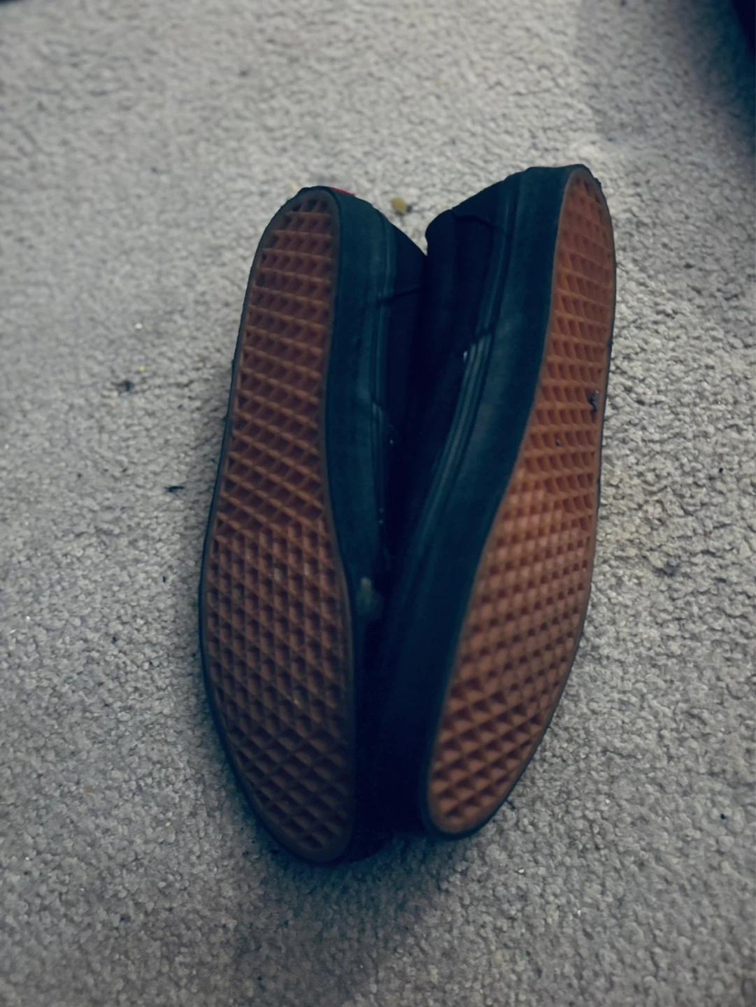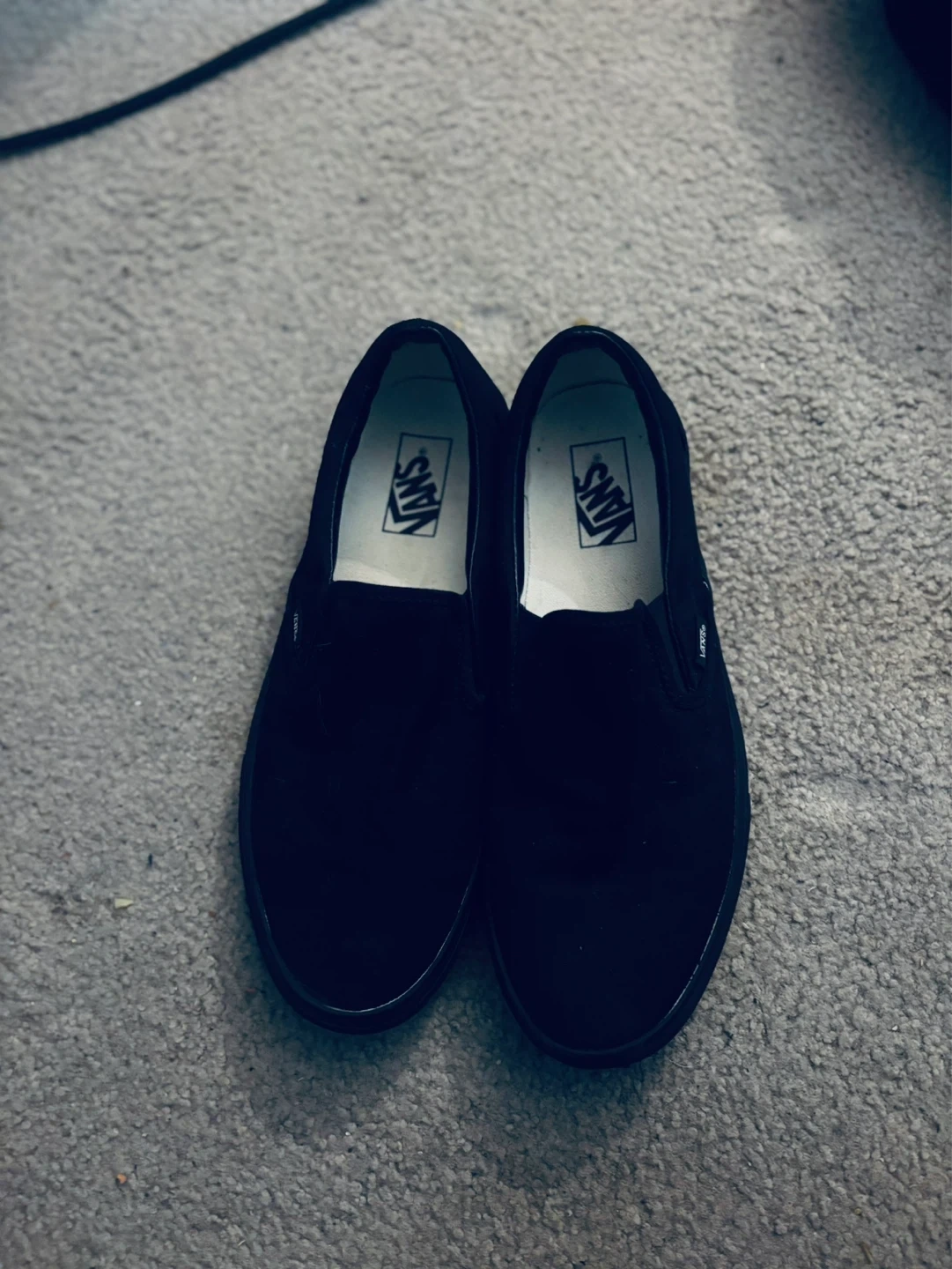 Black Vans Classic Slip-On shoes. Suede upper with a comfortable slip-on design. Features the iconic Vans waffle sole. Men's US size 10. Pick up in Terwillegar.