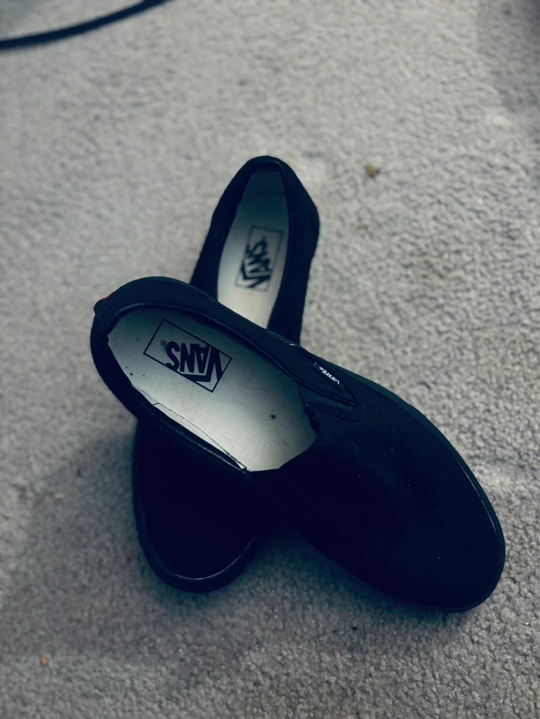 Black Vans Classic Slip-On shoes. Suede upper with a comfortable slip-on design. Features the iconic Vans waffle sole. Men's US size 10. Pick up in Terwillegar.