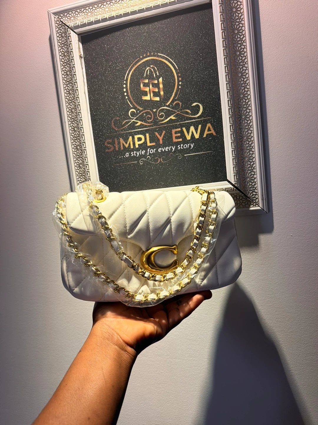 This white quilted crossbody bag features a chic gold chain strap. It has a classic design with diamond stitching and a prominent gold 'C' accent. The bag appears to be made of faux leather.