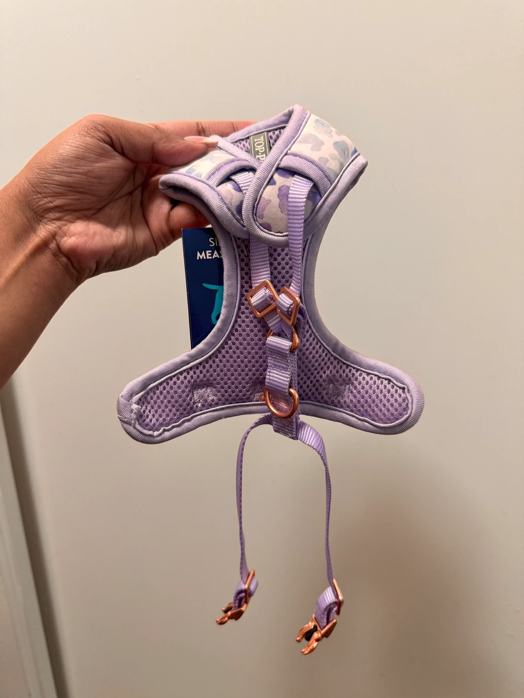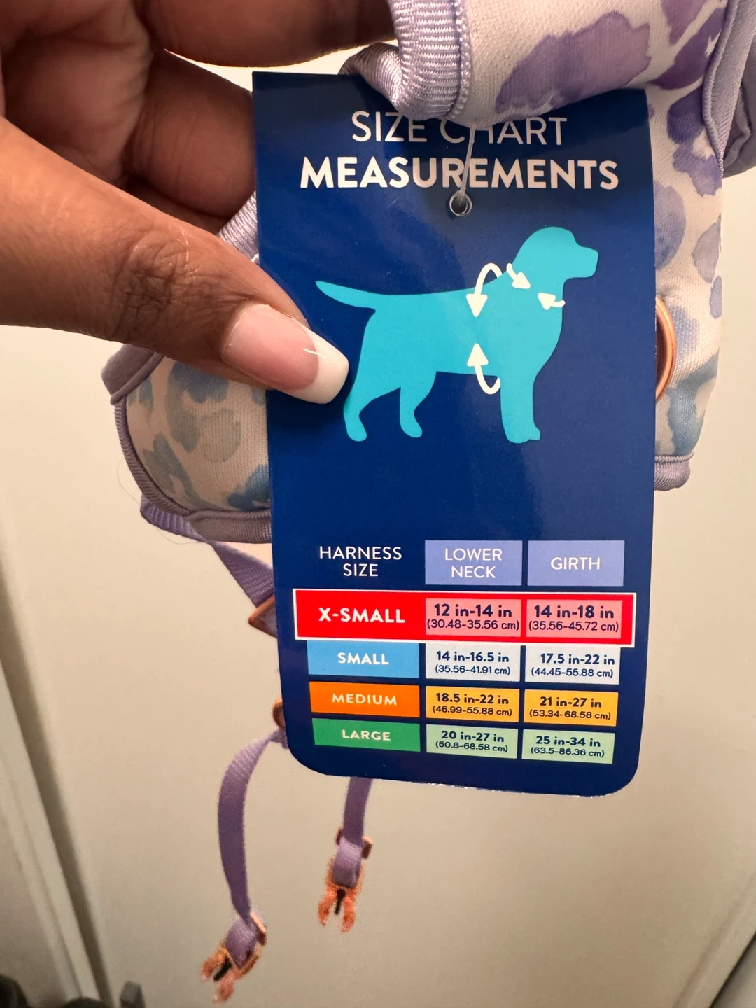 This is a TOP-PAW adjustable fashion comfort harness in X-Small. It's purple with a light blue and pink animal print. The neck size is 12-14 inches and the girth is 14-18 inches. This harness is designed for your dog's comfort and style!