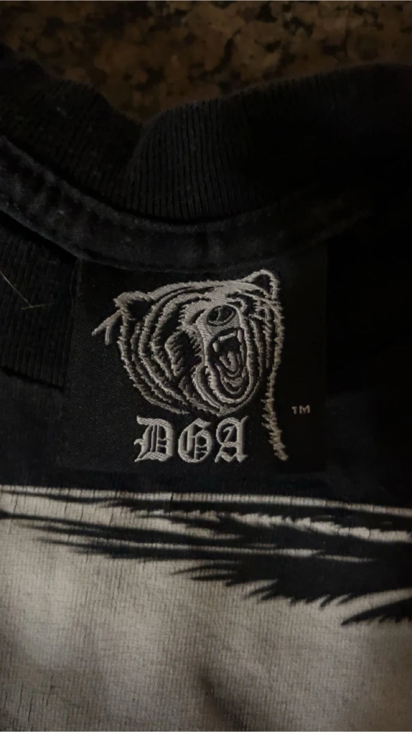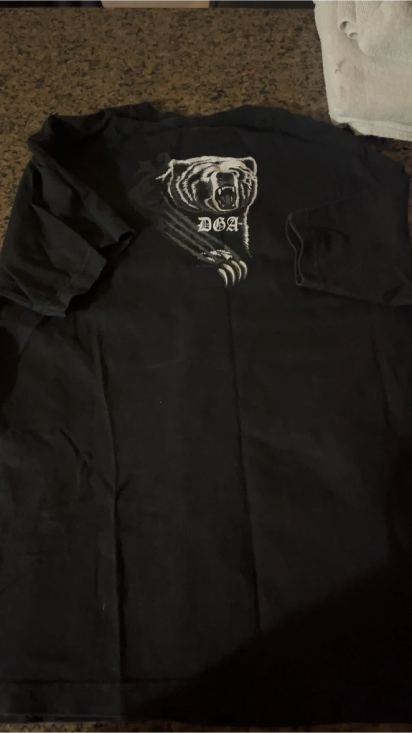 Black DGA t-shirt with a bear graphic on the back and a 'Reflections' graphic with a car on the front. Cotton material. Size medium