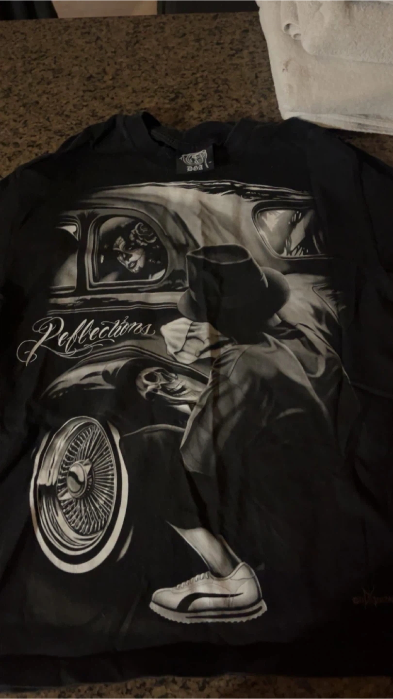 Black DGA t-shirt with a bear graphic on the back and a 'Reflections' graphic with a car on the front. Cotton material. Size medium