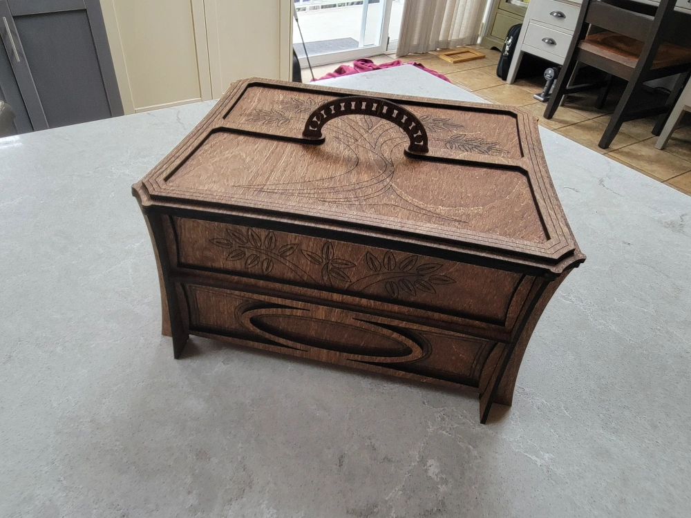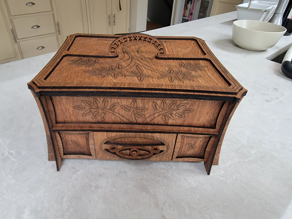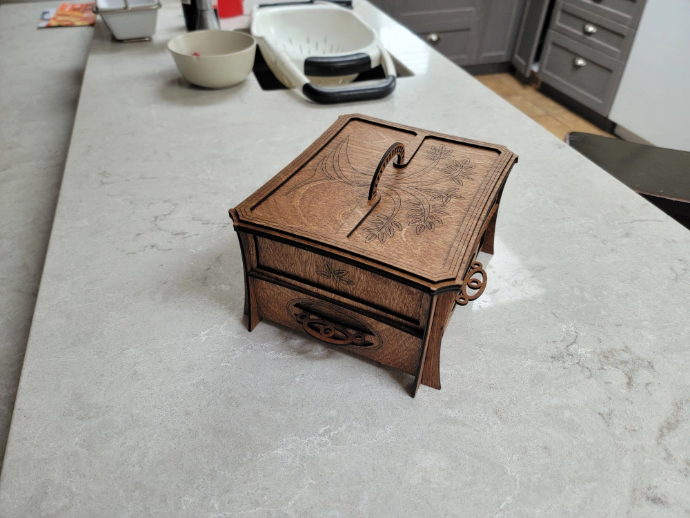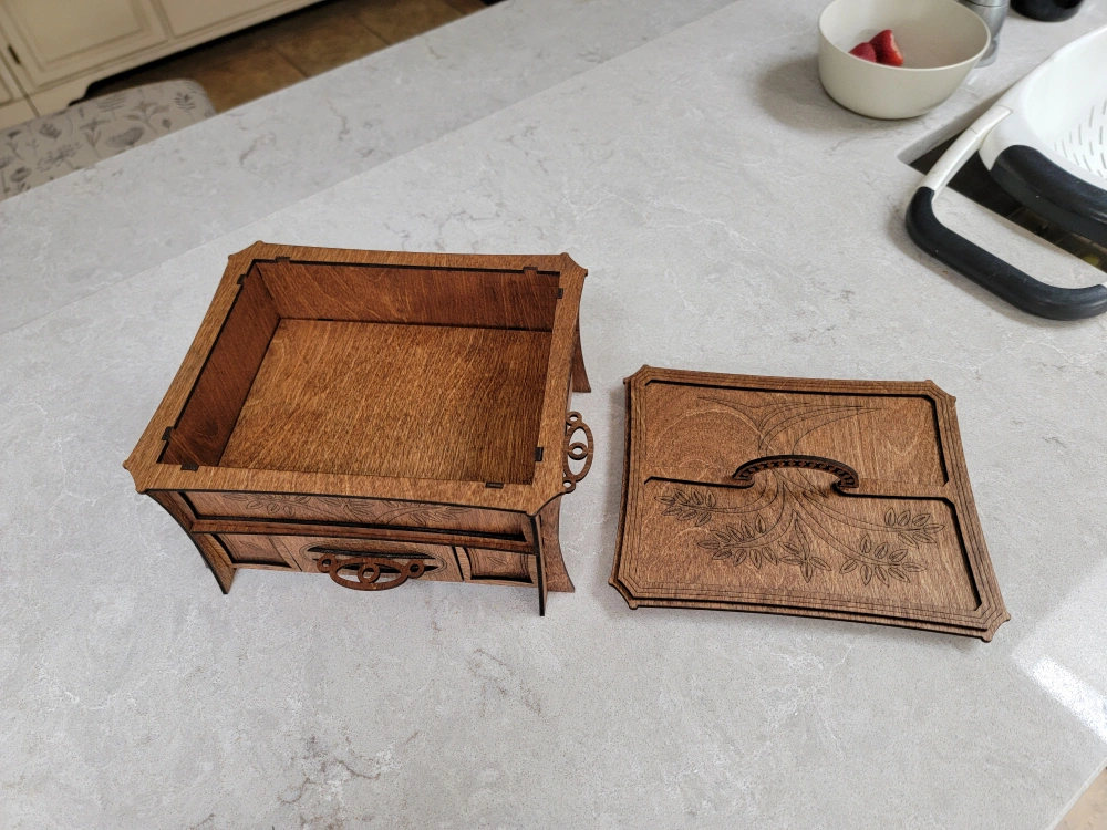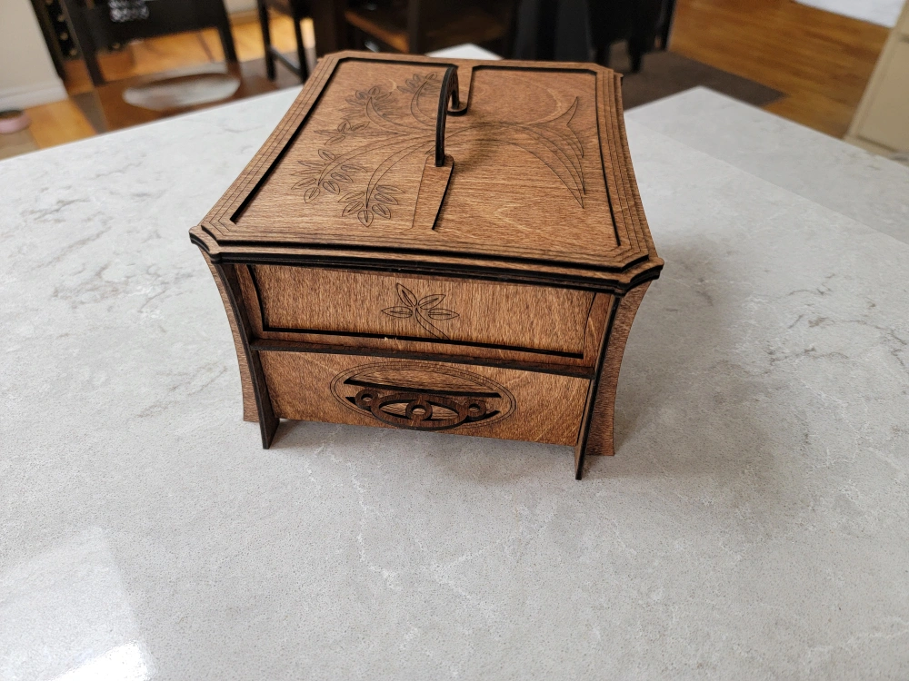 Beautiful wooden box, perfect for organizing your jewelry. Features a main compartment, a pull-out drawer, and several smaller removable trays. Intricate laser-cut design. Dark stained wood finish.