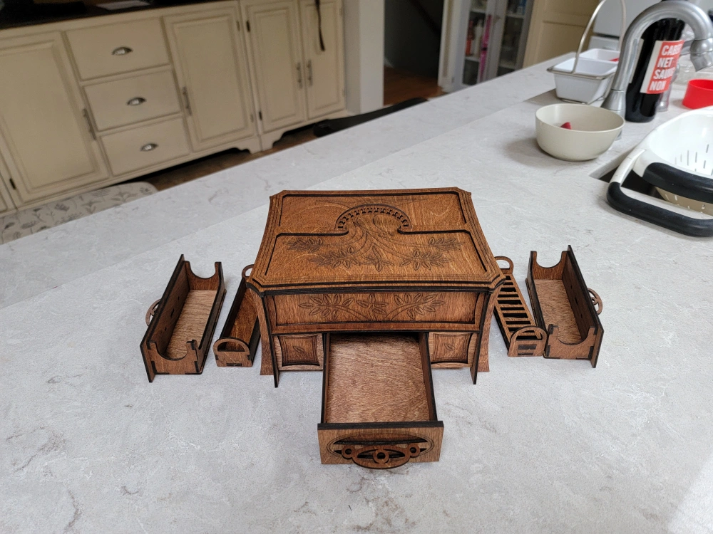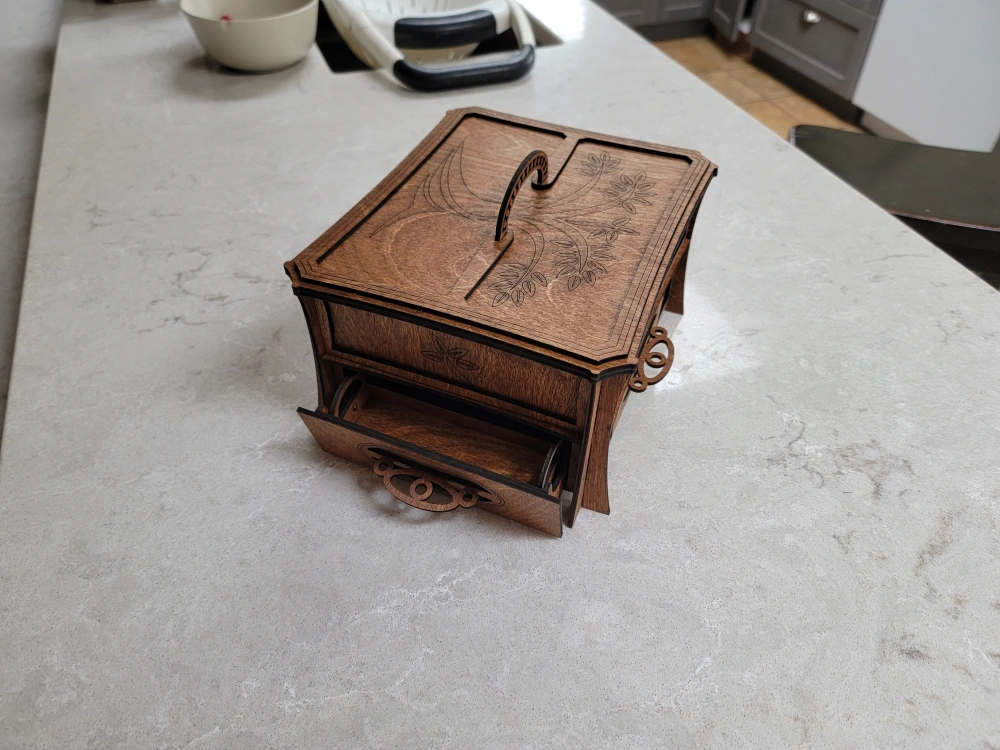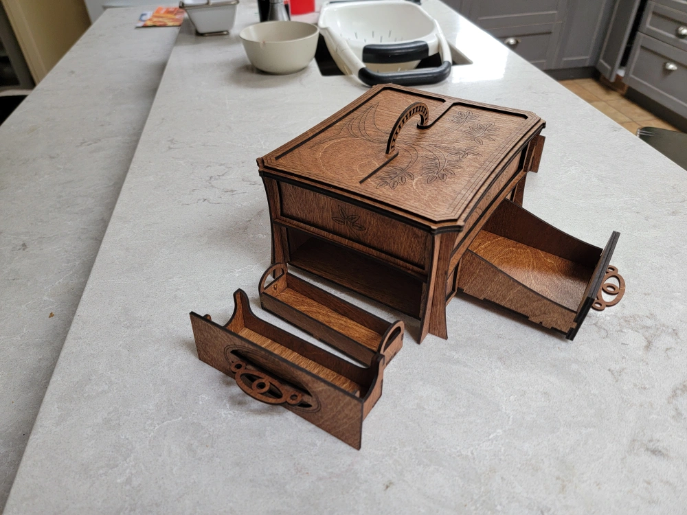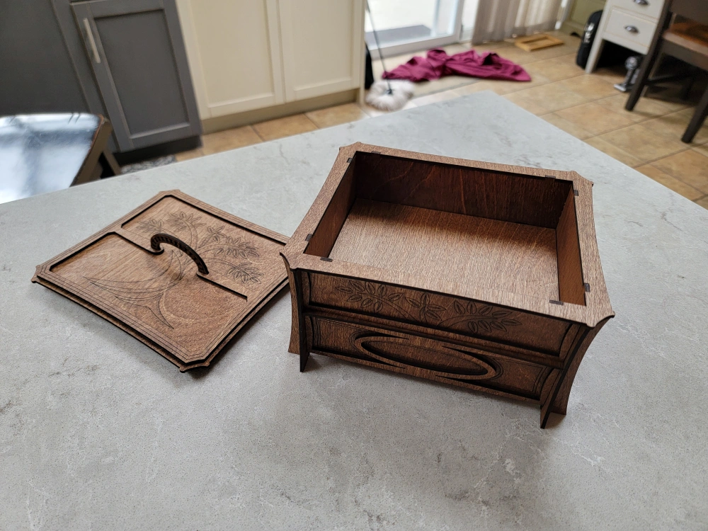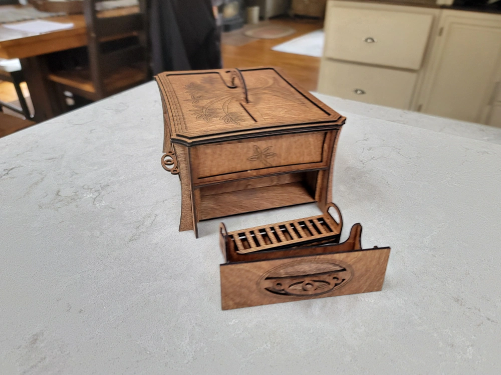 Beautiful wooden box, perfect for organizing your jewelry. Features a main compartment, a pull-out drawer, and several smaller removable trays. Intricate laser-cut design. Dark stained wood finish.