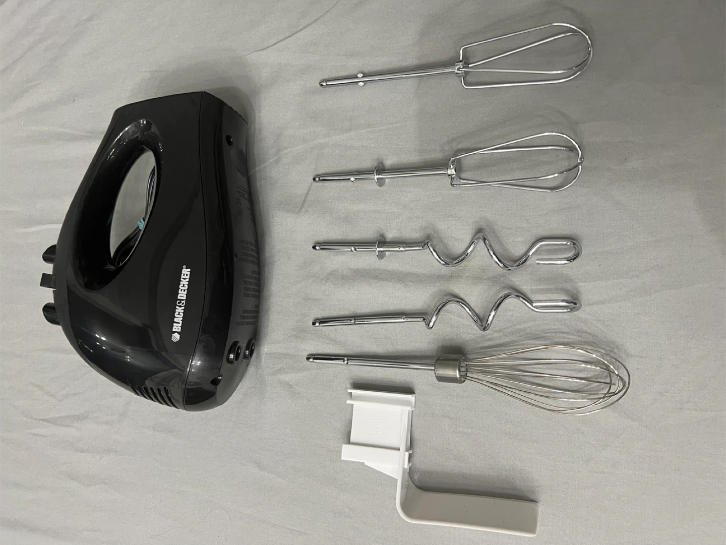This Black & Decker 250-watt hand mixer comes with 6 speeds and essential accessories. It includes 2 wire beaters, 2 dough hooks, 1 whisk, and 1 spatula. A handy storage case keeps everything together in one place!