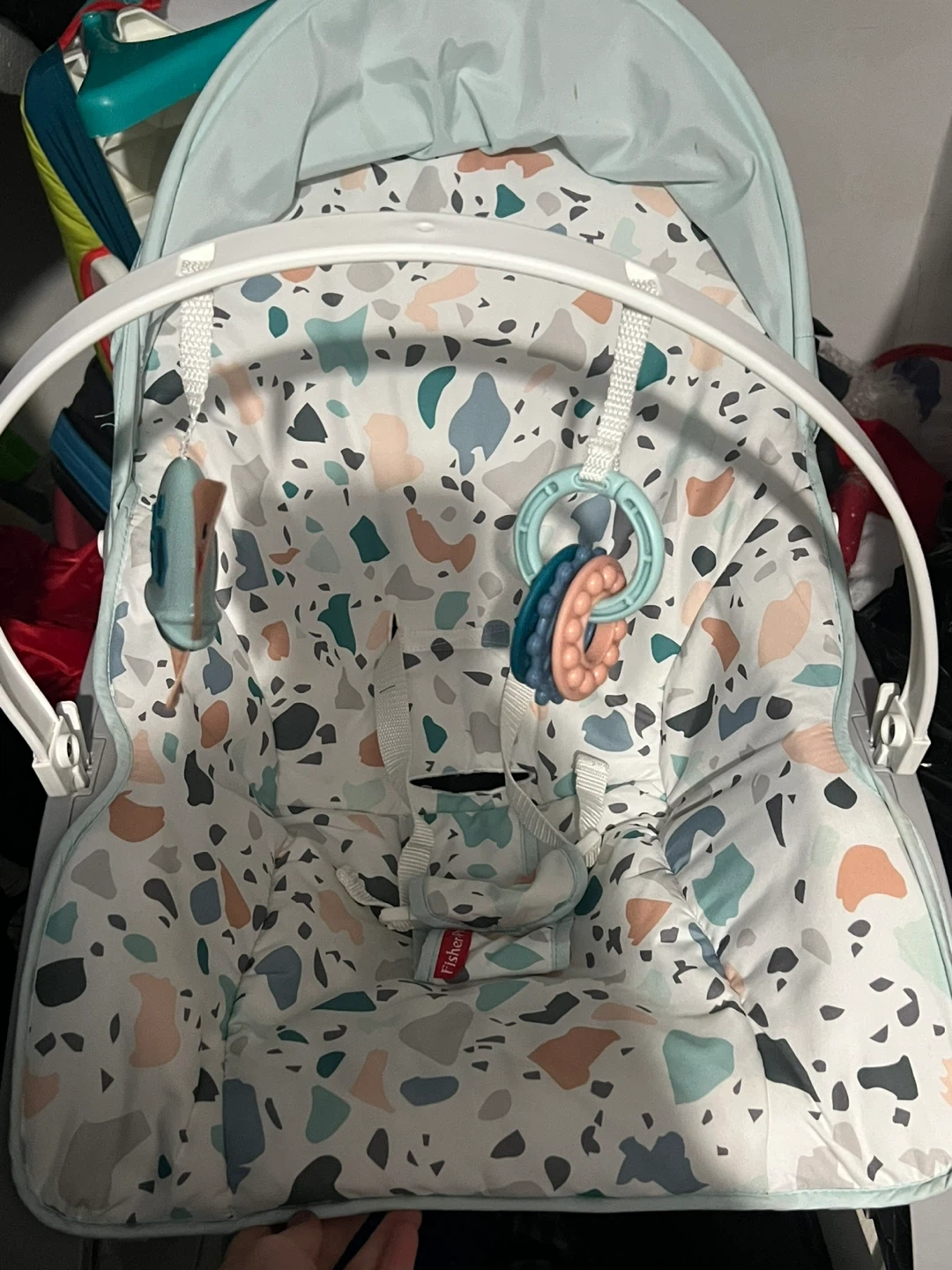 The seat has a secure harness and soft padding for comfort. It's suitable for newborns and up. This is a fun and safe spot for baby to relax and play!