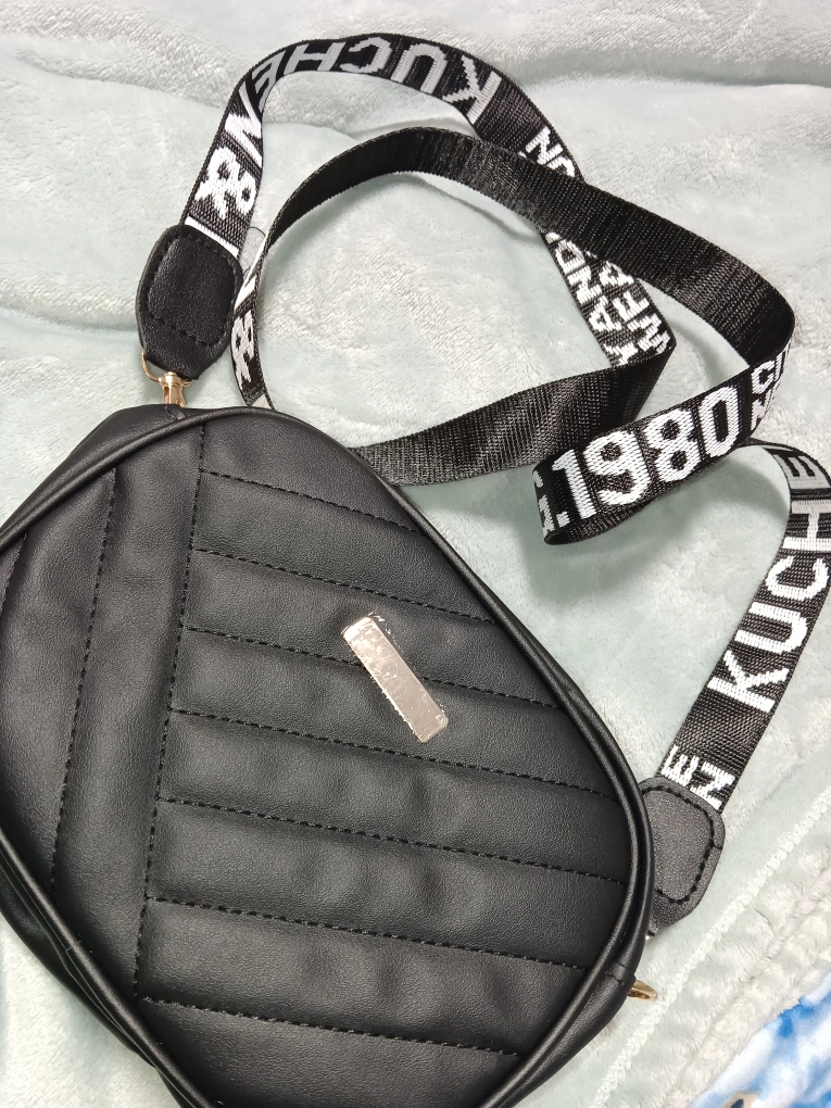Small, black quilted crossbody bag with an adjustable strap. The strap features a black and white logo. New and never used it.