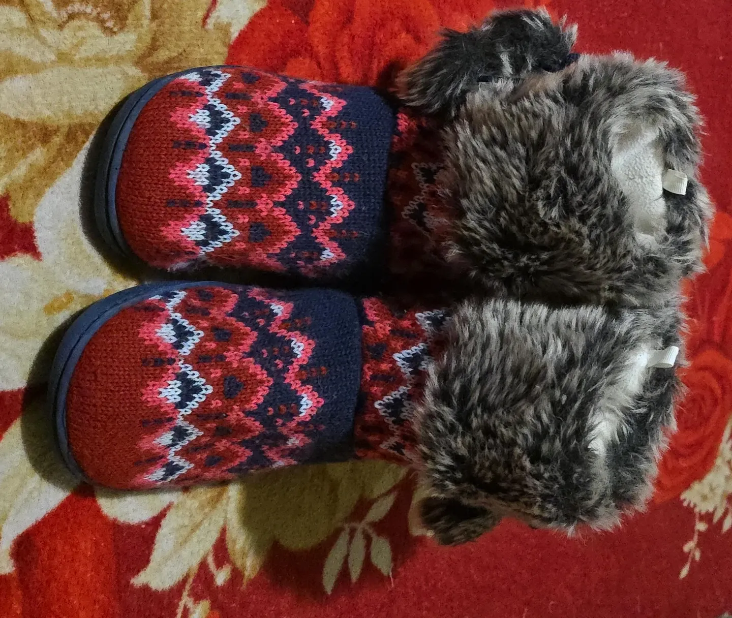 Cozy knit slippers with a colourful fair isle pattern and warm faux fur lining. They're perfect for keeping your feet warm on chilly days. The soles are sturdy for light indoor use. These slippers are great for anyone who loves to relax at home!
