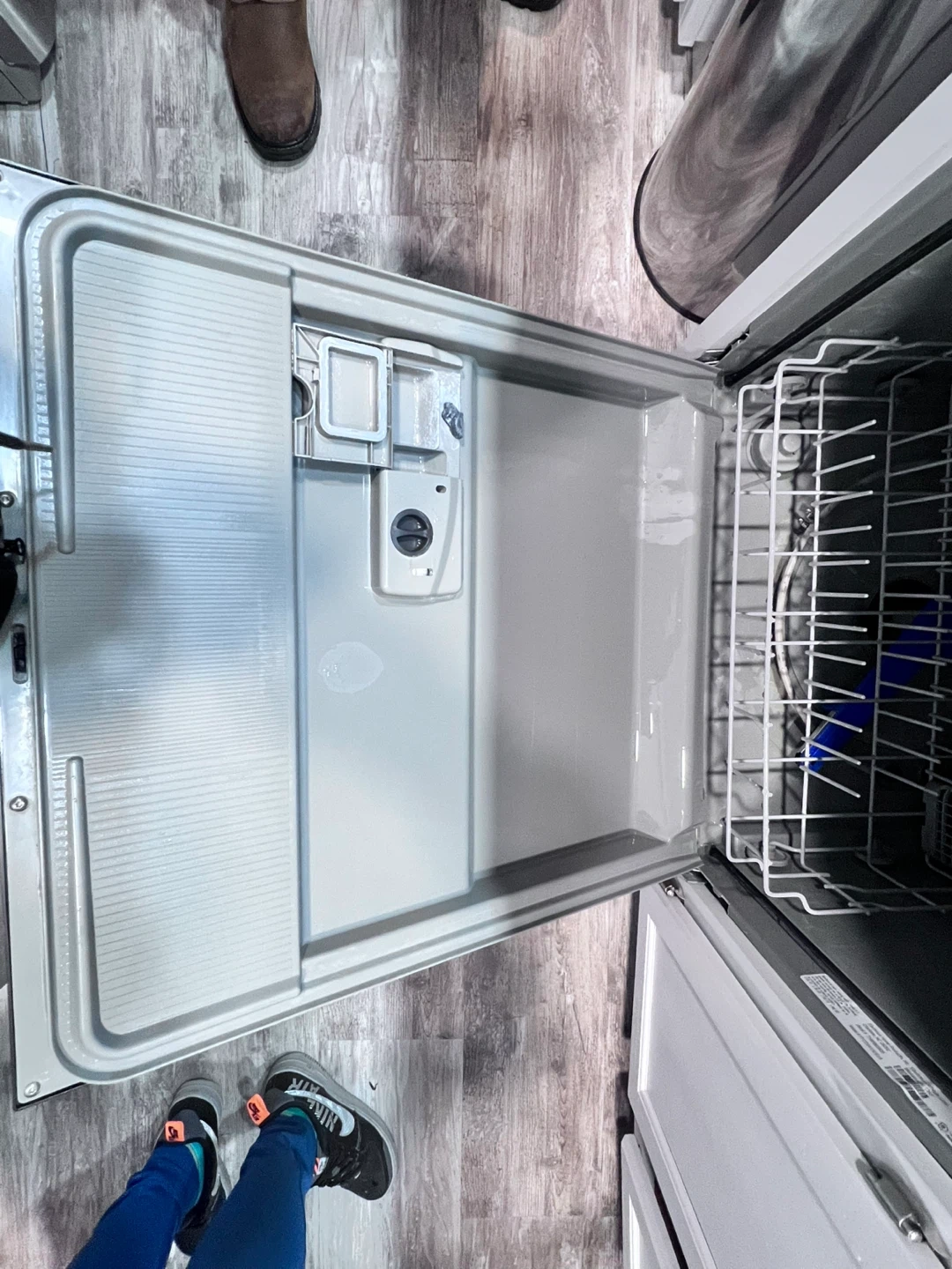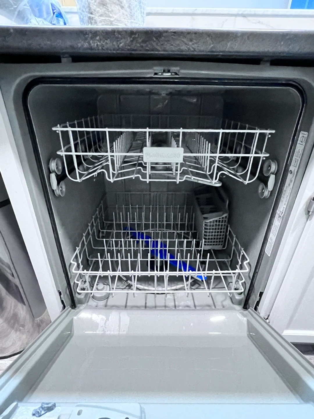 This is a Frigidaire stainless steel dishwasher. It has two racks for dishes and a cutlery basket. The interior is clean and ready for use. It's a standard-sized appliance for any kitchen.