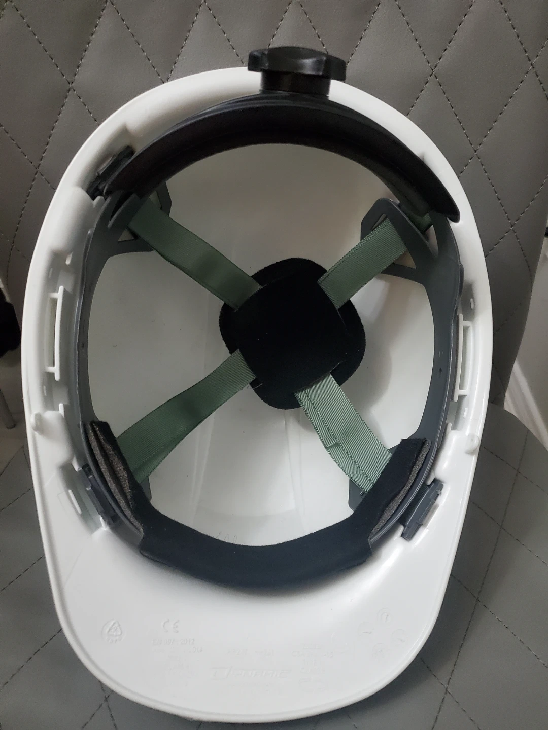 White construction safety hard hat. It features a comfortable adjustable suspension system for a secure fit. This hard hat meets safety standards for head protection on job sites.
