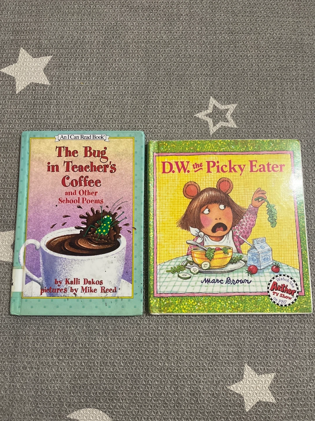 This lot includes two children's books: 'The Bug in Teacher's Coffee and Other School Poems' by Kalli Dakos and 'D.W. the Picky Eater' by Marc Brown. Both are paperbacks and part of the 'An I Can Read Book' series.