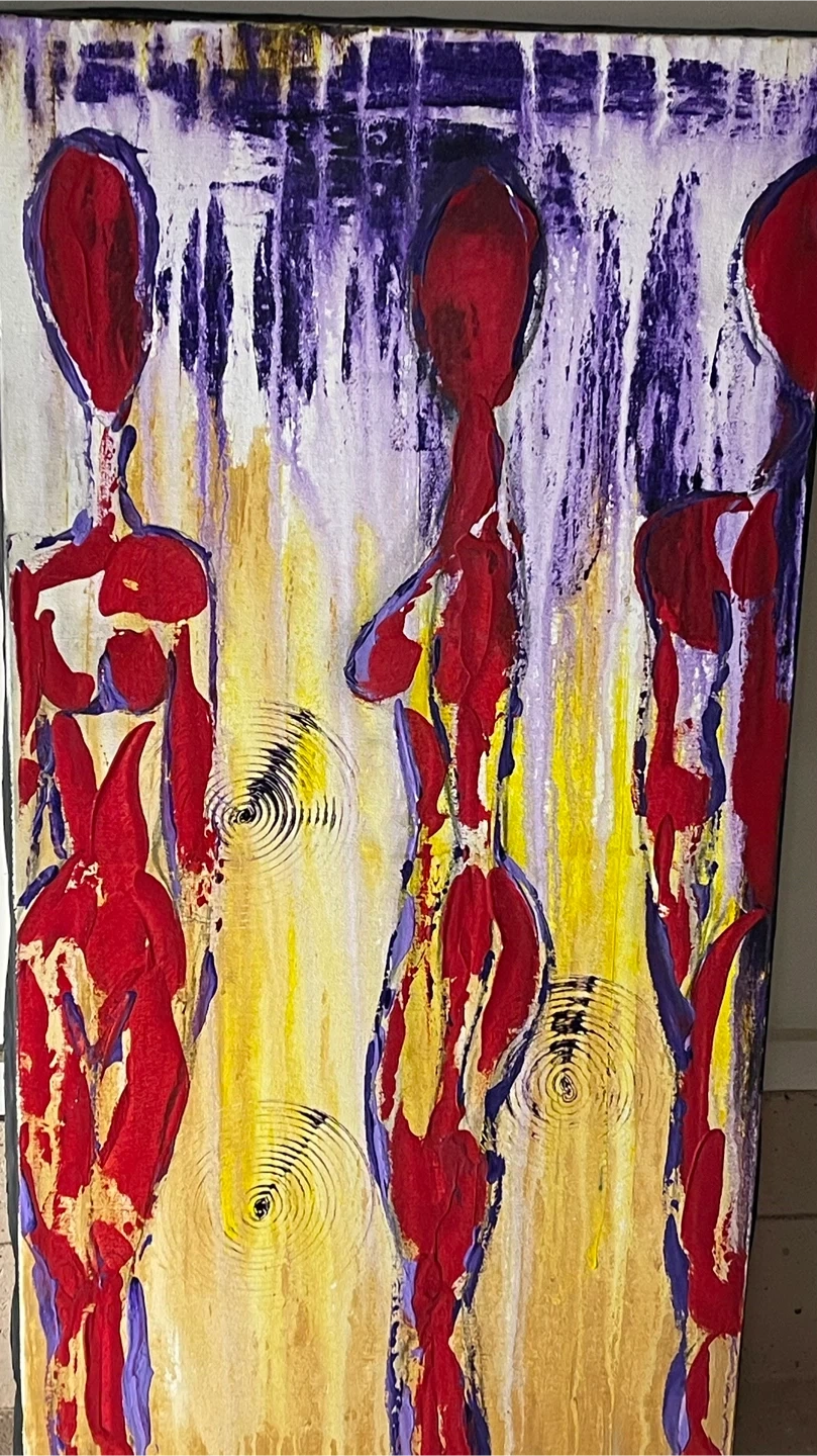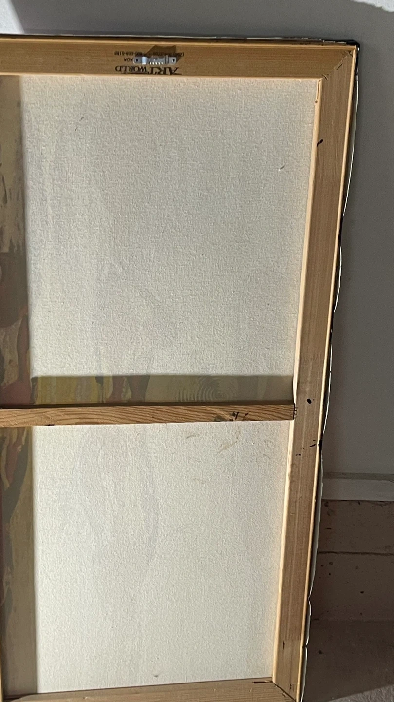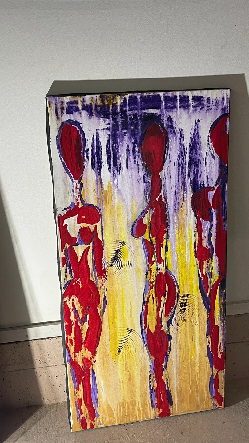 Selling an abstract painting by Art World! It features a vibrant colour palette of red, yellow, and purple, with a unique design. It's a great piece to add some character to any room!